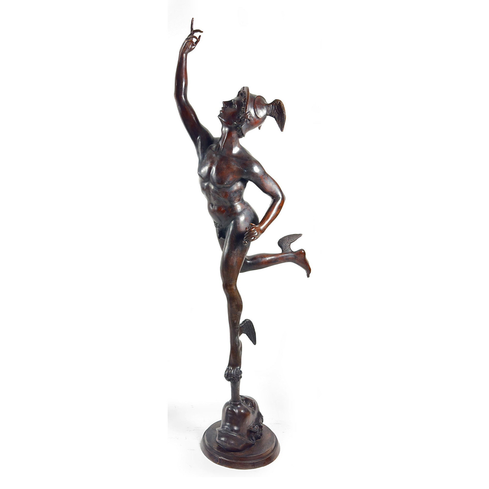 Grande scultura in bronzo patinato raffigurante il Mercurio Volante,...