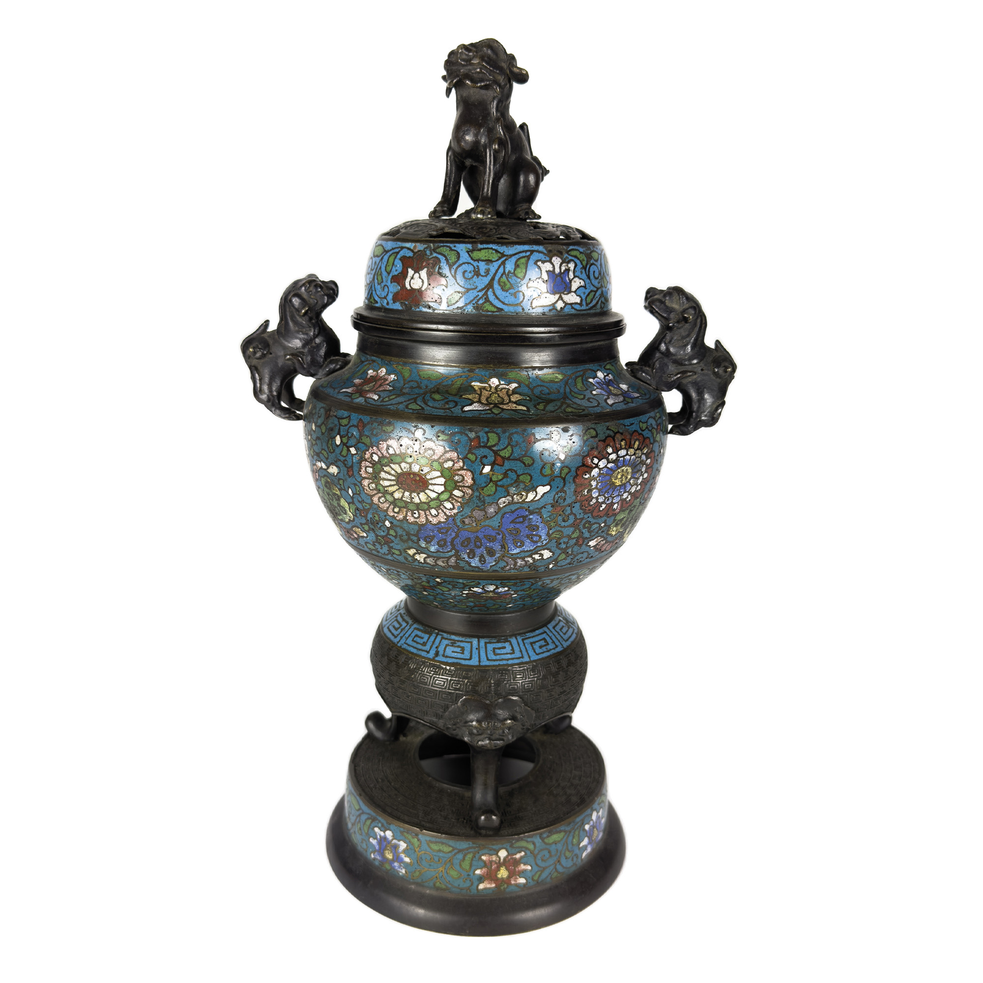 Bruciaessenze in bronzo patinato e smalti cloisonné, Arte orientale, XIX secolo, modellato in forma di vaso con coperchio con anse cesellate a figurine di cane così come la presa del coperchio; tre piedi ricurvi su base circolare, h. cm. 43
