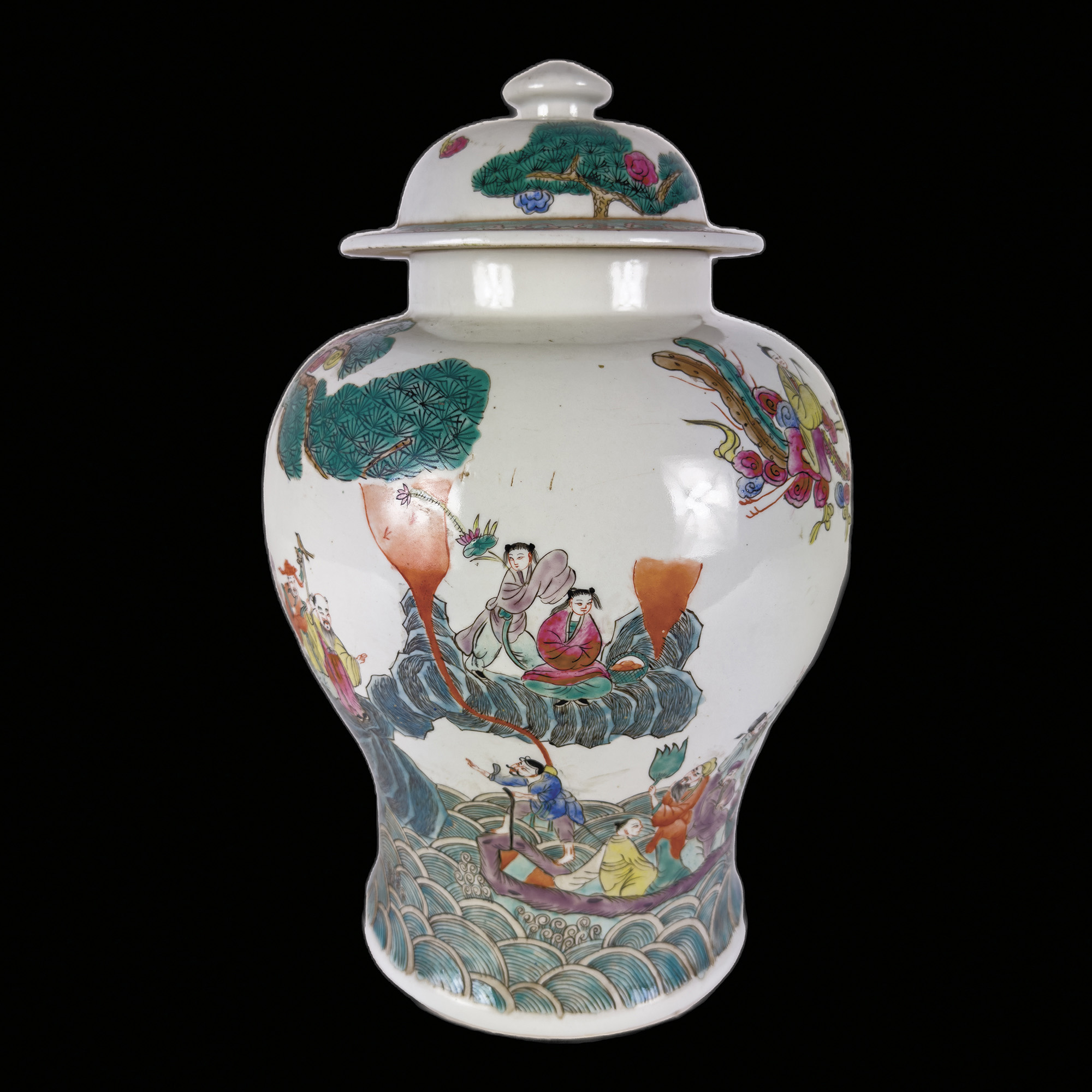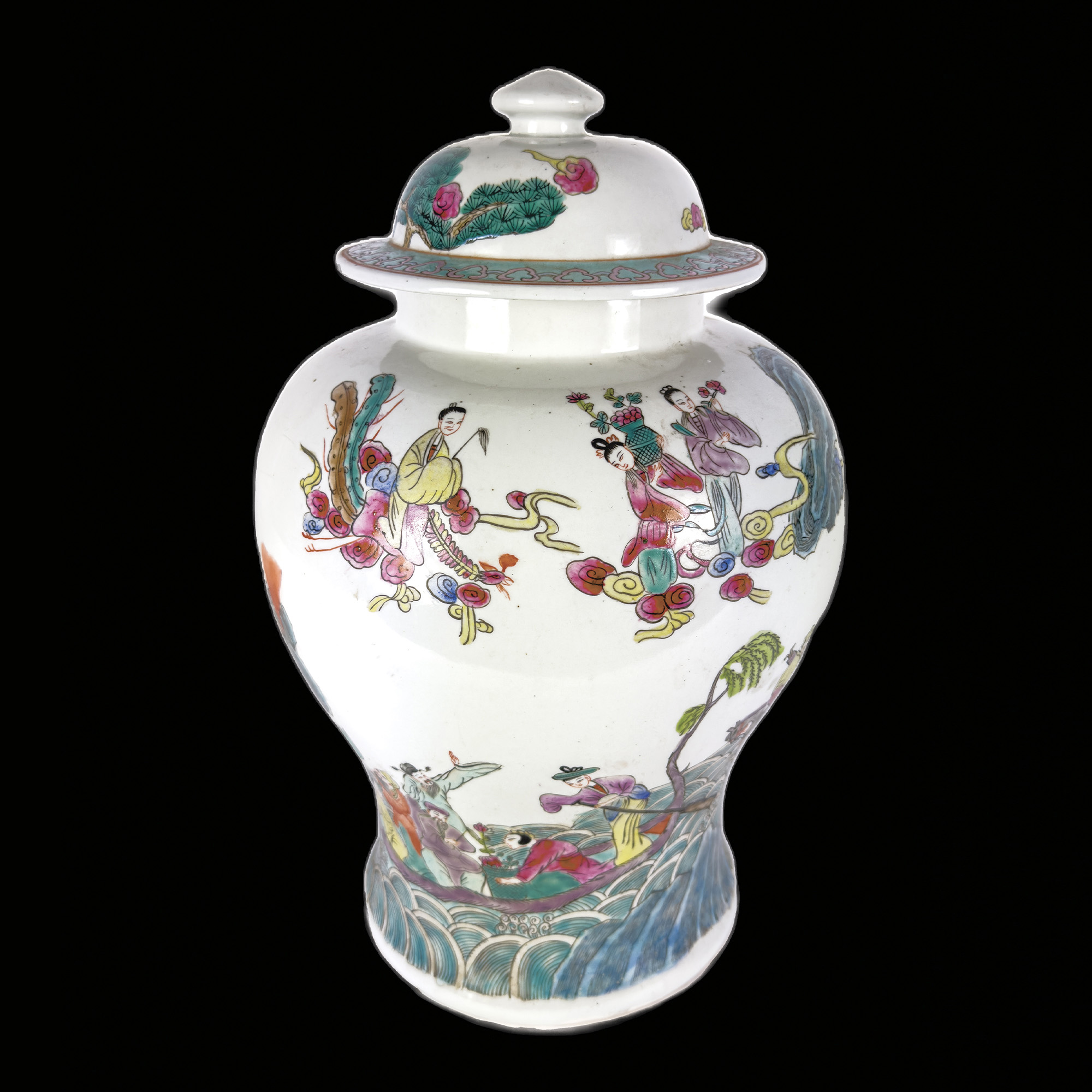 Potiche in porcellana bianca e policroma, Arte orientale, dipinta a paesaggi con figure e arbusti; coperchio a cupolino, h. cm. 42