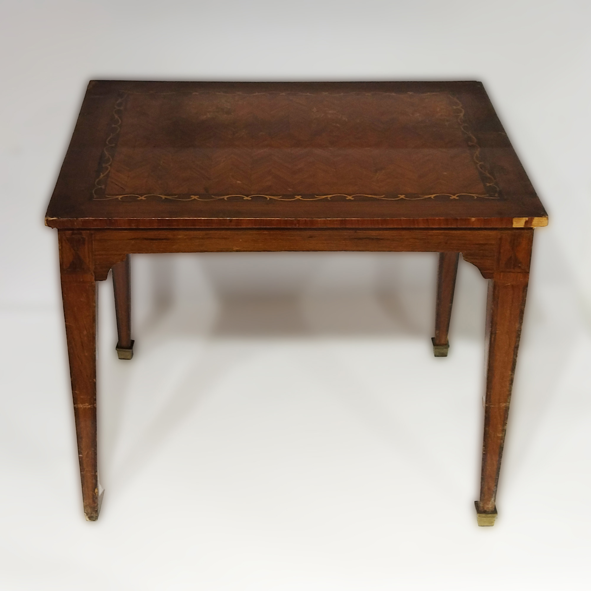 Piccolo tavolino da appoggio, XX secolo, impiallacciato in legni di varie essenze; piano rettangolare su gambe a obelisco, cm. 46x58x43 (qualche difetto)