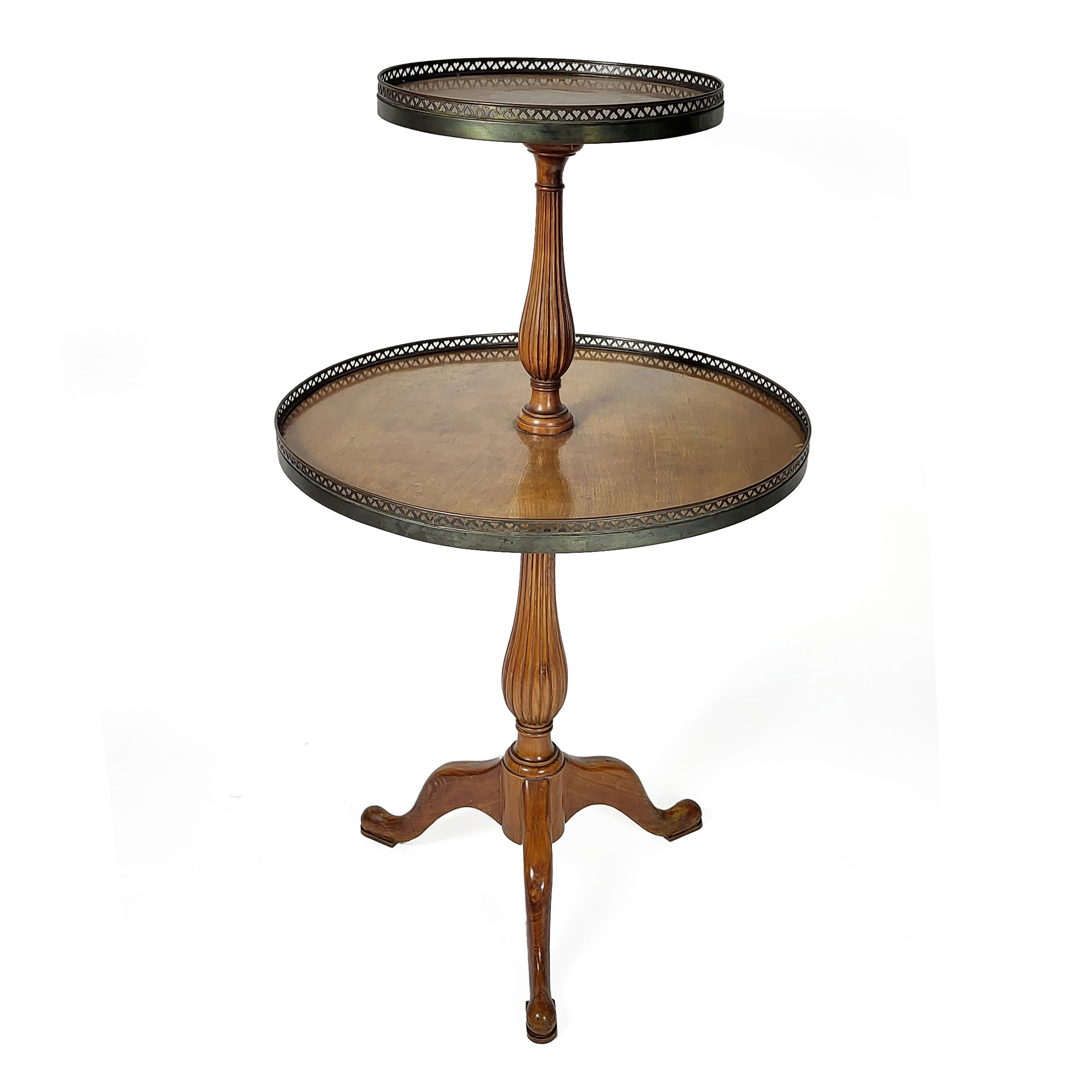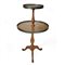 Servomuto di mogano, inizi del XX secolo, qualificato da due ripiani circolari di diverso diametro muniti di ringhierina in metallo; unico montante centrale a balaustro baccellato su tre piedi di linea mossa, h. cm. 110; il piano superiore d. cm. 40; quello inferiore d. cm. 67