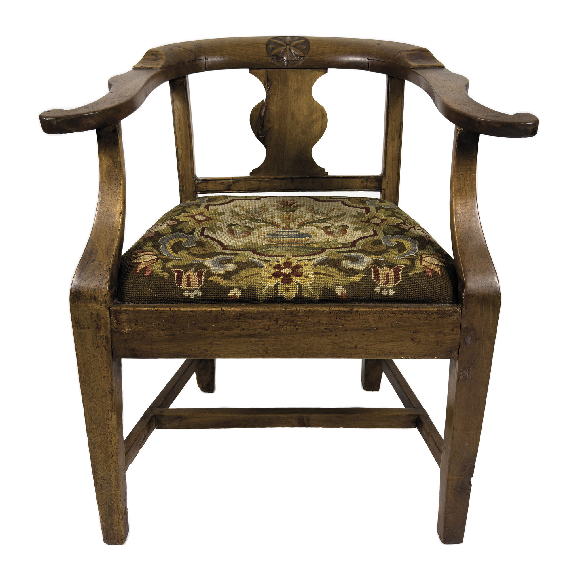 Poltrona di noce, XIX secolo, con schienale a giorno di linea avvolgente; seduta imbottita e ricamata a petit point