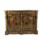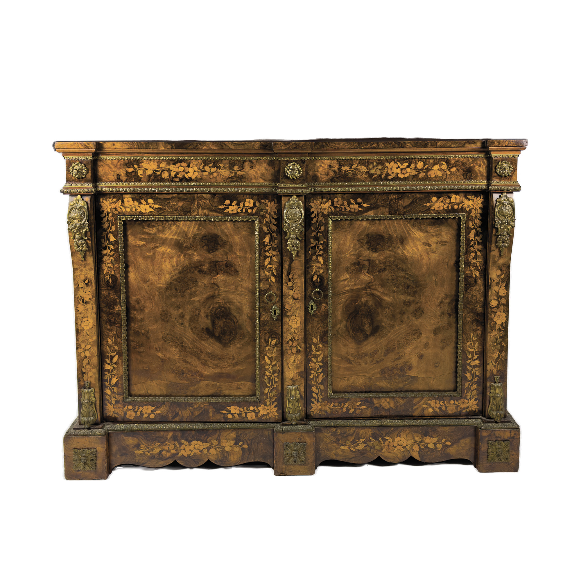 Servante lastronata in radica di noce, Francia, XIX secolo, intarsiata a motivi floreali. Piano mistilineo; due ante sul fronte; gambe a plinto: applicazioni in bronzo e metallo dorato completano l'ornato, cm. 114x150x34,5