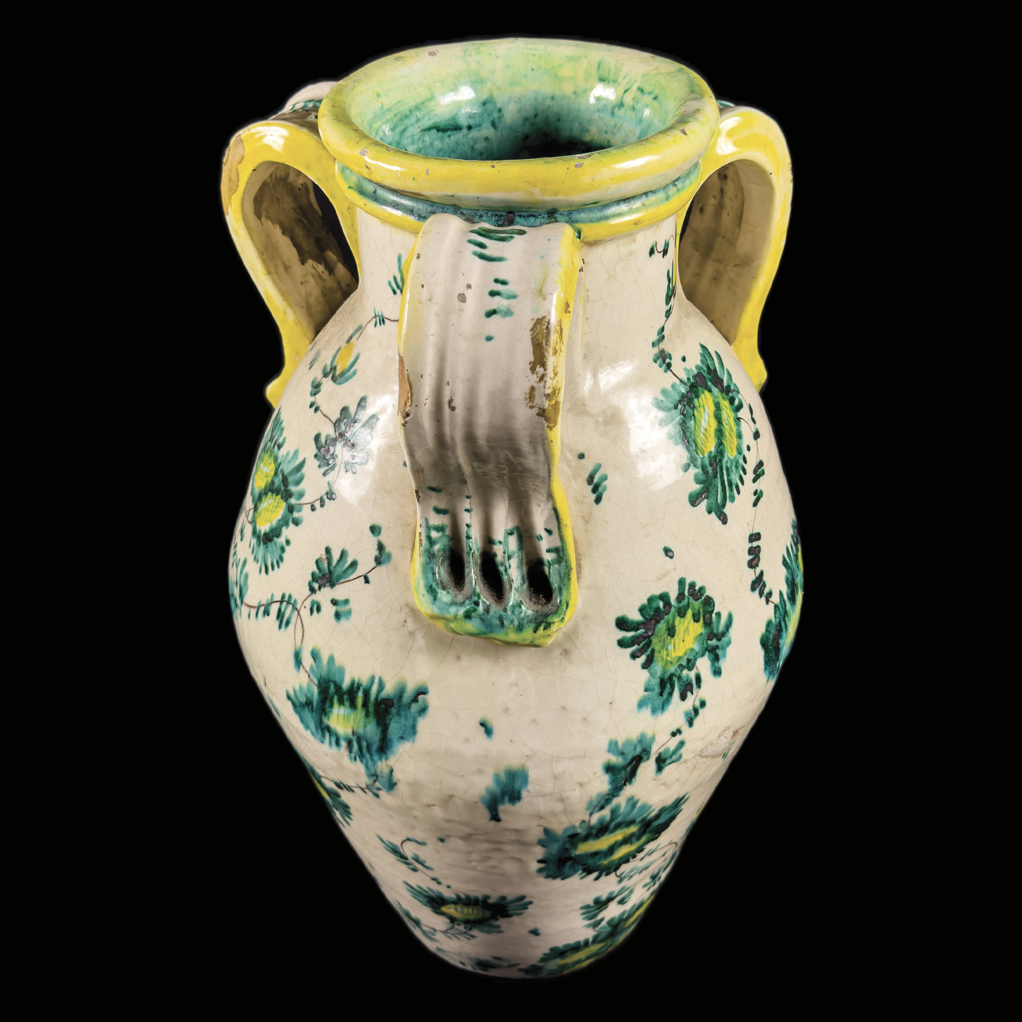 Grande vaso biansato in maiolica bianca e verde, XIX secolo, decorato a tralci fioriti; tre anse disposte attorno al collo, h. cm. 60 (difetti)