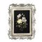 Placca rettangolare in marmo nero intarsiata in commesso di marmi policromi, raffigurante una composizione floreale; cornice in argento cesellato a foglie di quercia, la placca cm. 16x11