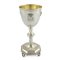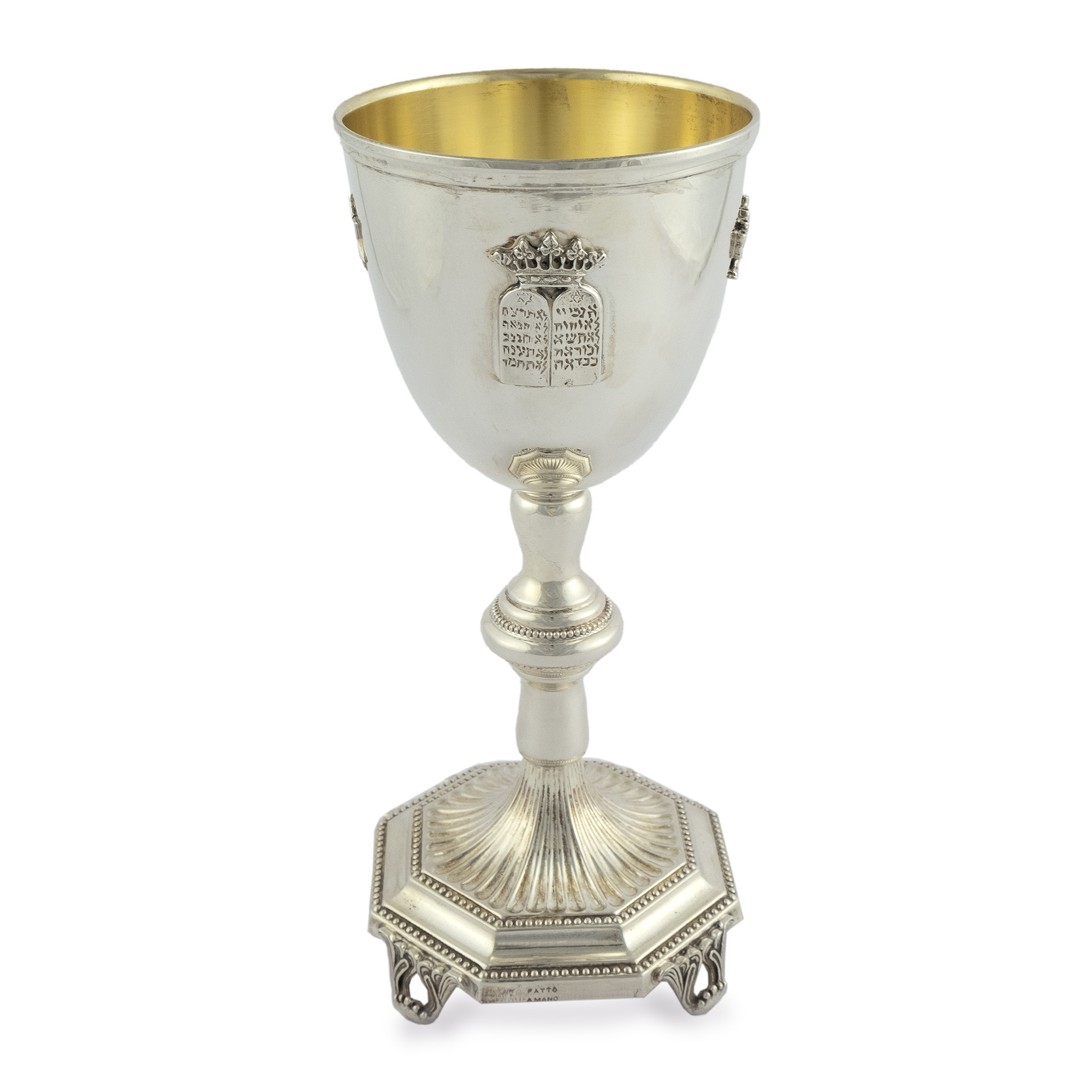 Calice in argento, XX secolo, coppa a superficie liscia caratterizzata da simboli del culto ebraico; base ottagonale su quattro piedini traforati, h. cm. 21, peso gr. 239