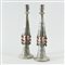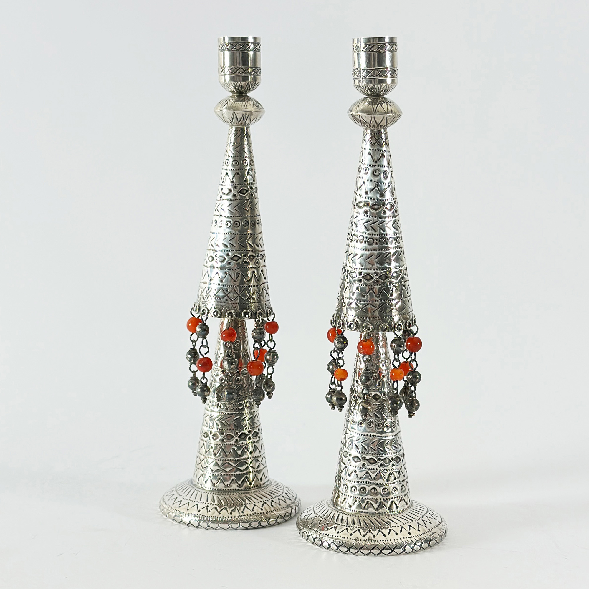 Coppia di candelieri in argento, Manifattura orientale, con stelo formato da due elementi conici sovrapposti su piede circolare; guarnizione di pendagli con sferette colorate, h. cm. 23, peso complessivo gr. 197