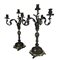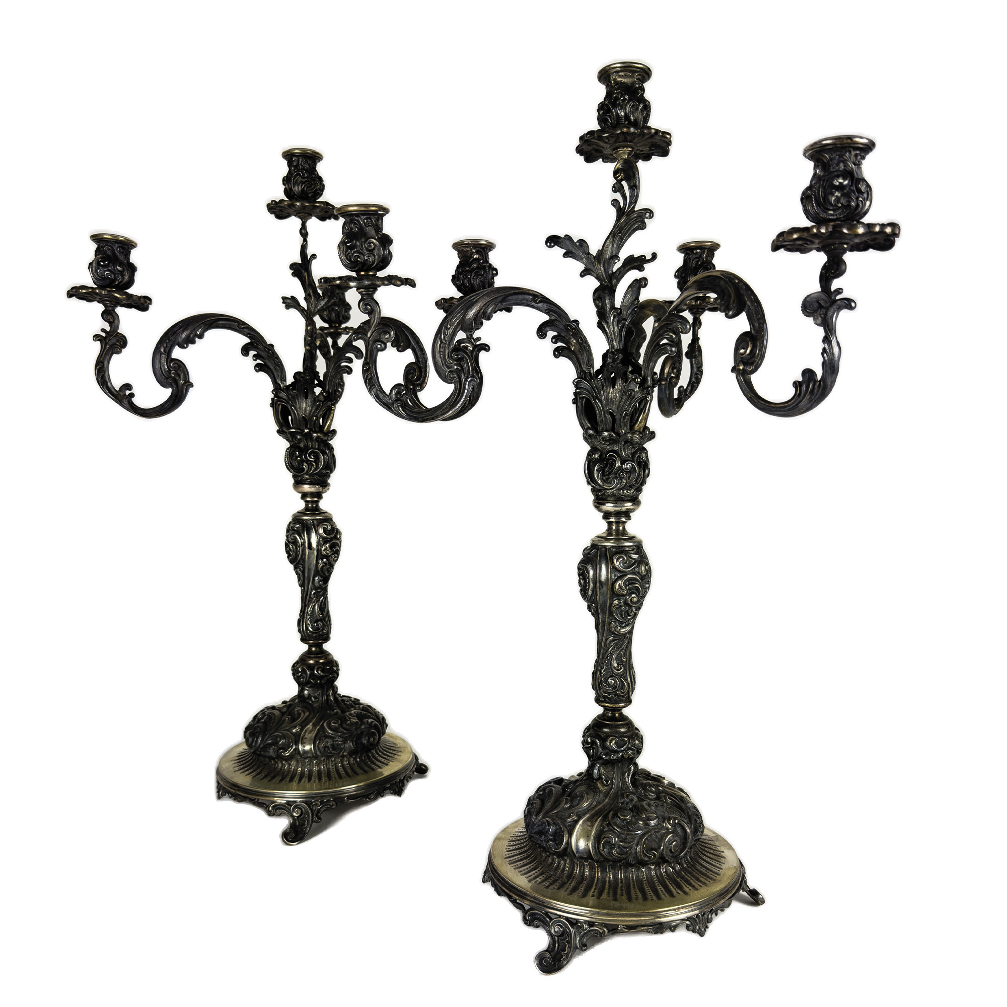 Coppia di candelabri a quattro luci in argento, Milano, Virginio Pobbiati, XX secolo, fusto sbalzato a volute che sorregge quattro bracci per candele cesellati a composizioni fogliate; piede circolare, h. cm. 64, peso complessivo gr. 6.880