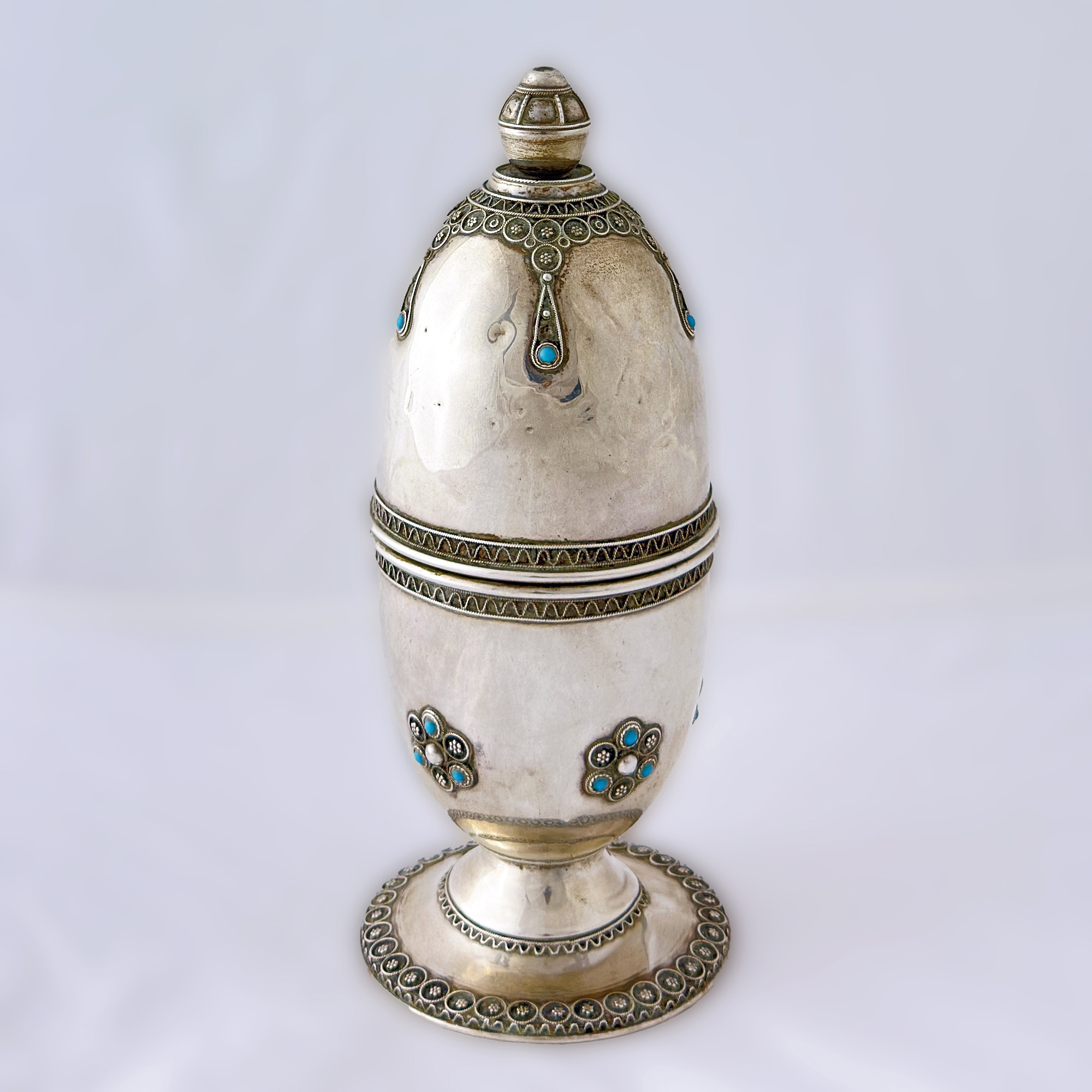 Porta Etrog in argento, XX secolo, di forma ovoidale; base circolare, h. cm. 20,5, peso gr. 165 (ammaccature)
