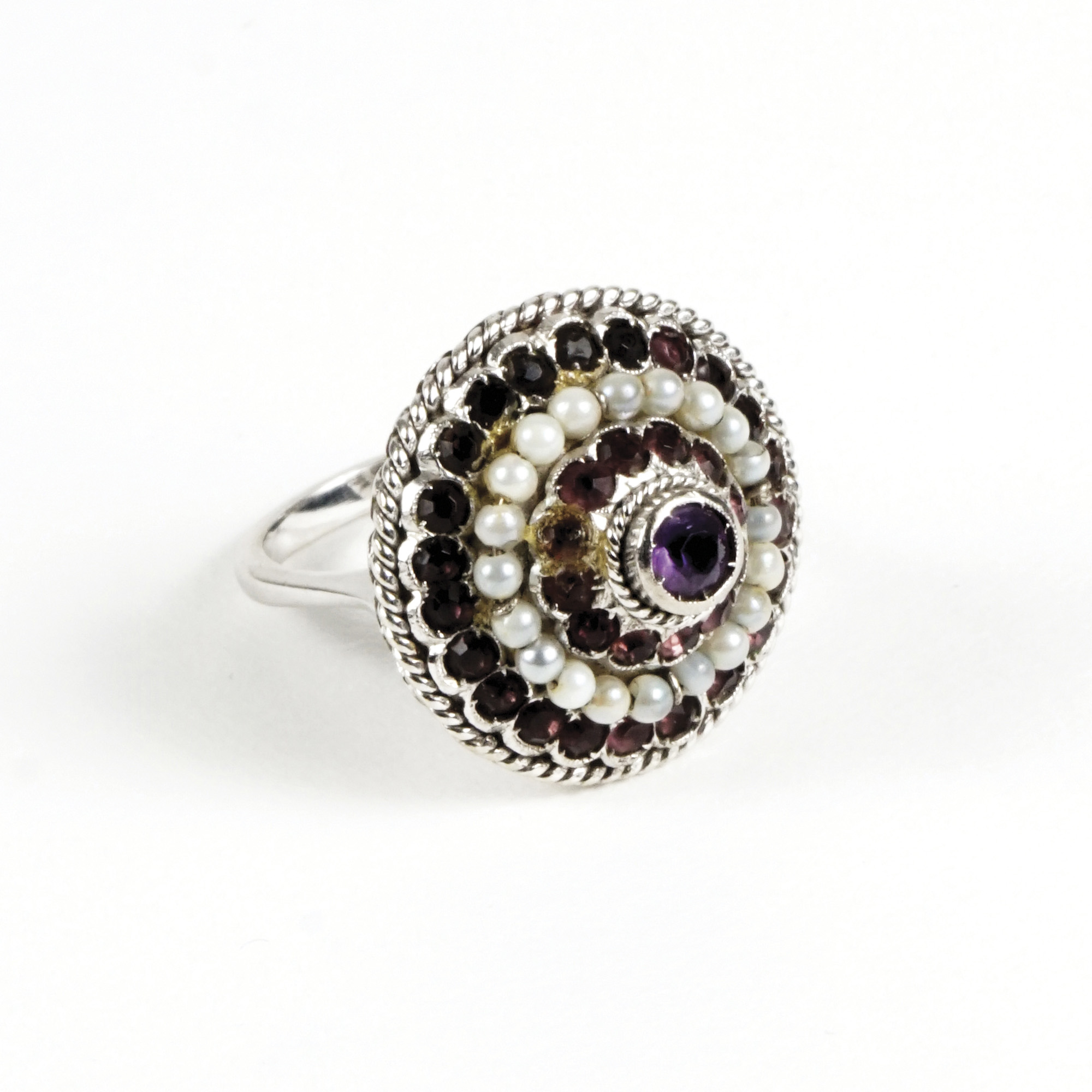 Anello in oro bianco 18kt. decorato da perline, ametista e granati, mis. 12, peso gr. 11