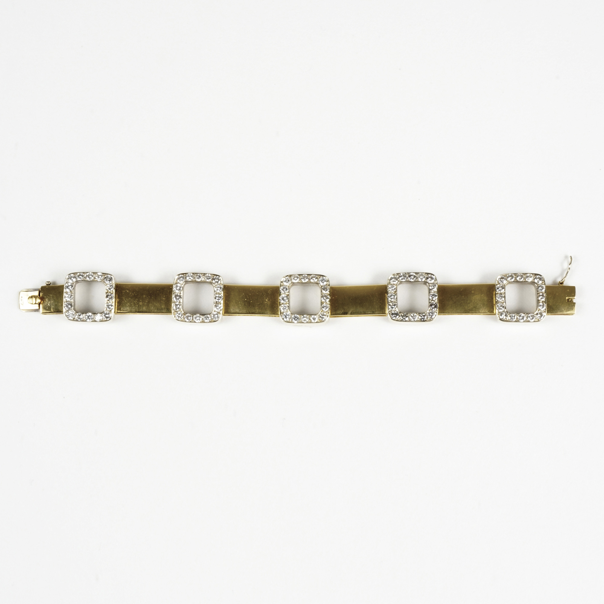 Bracciale in oro giallo e oro bianco 18kt. a segmenti con guarnizione di diamanti, l. cm. 17,5, peso gr. 54