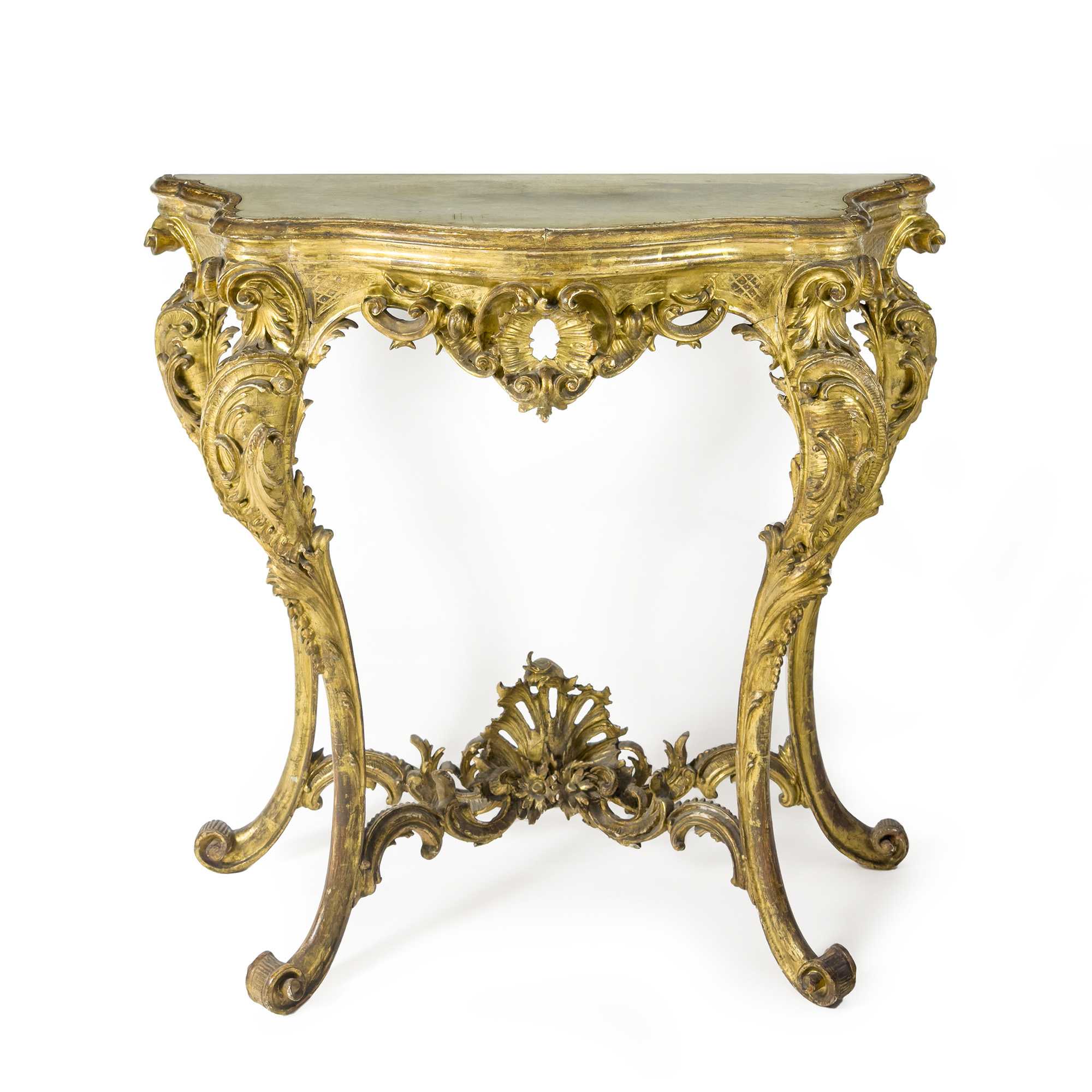 Console in legno dorato e intagliato, Genova, XVIII secolo, piano di marmo bianco incassato dal profilo centinato; la fascia segue l'andamento del piano ed è riccamente intagliata a corpose volute in parte a giorno che proseguono sulle alte gambe centinate per quasi tutta la lunghezza; traverse di riunione scolpite centrate da un ventaglio di foglie, cm. 97x104x46