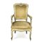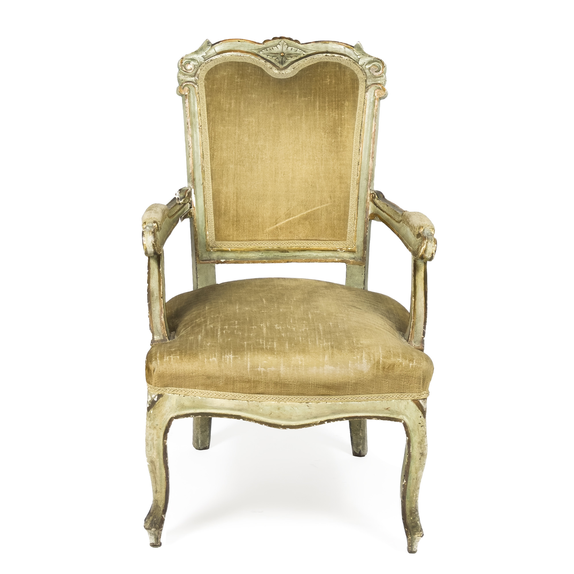 Poltrona in legno laccato verde e dorato, XVIII secolo, dossello superiormente centinato intagliato a volute centrate da un rosone fogliato; braccioli lievemente curvi desinenti in un ricciolo, poggianti su montanti di linea mossa così come le gambe.