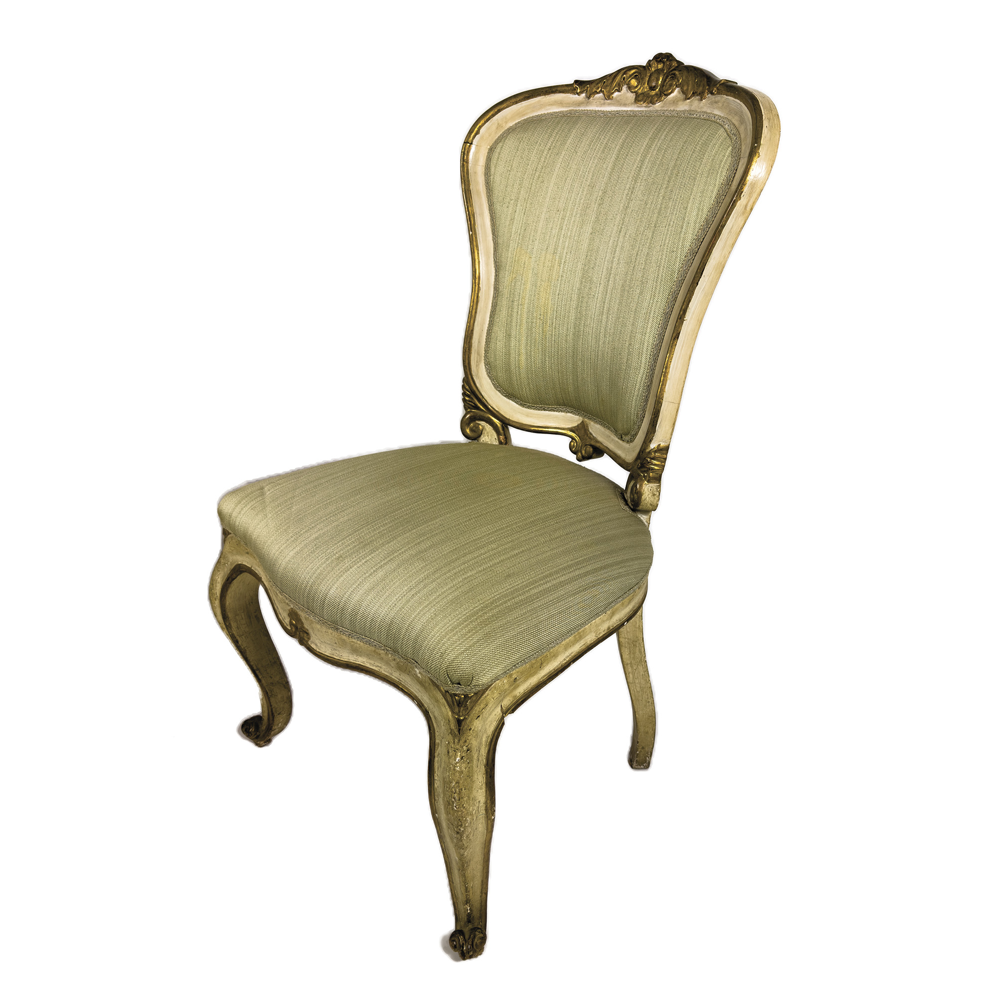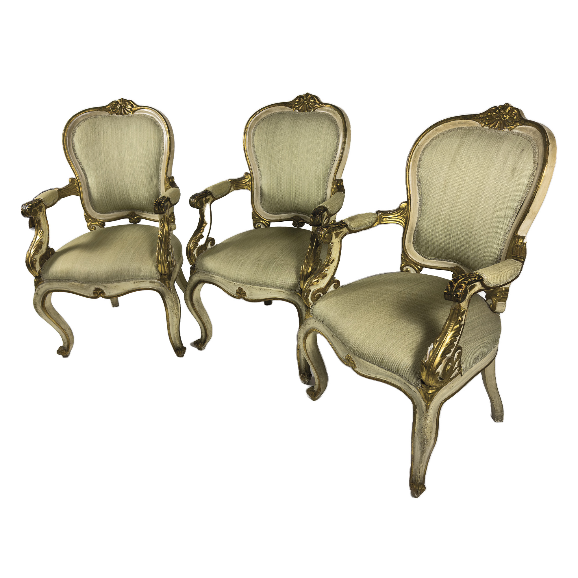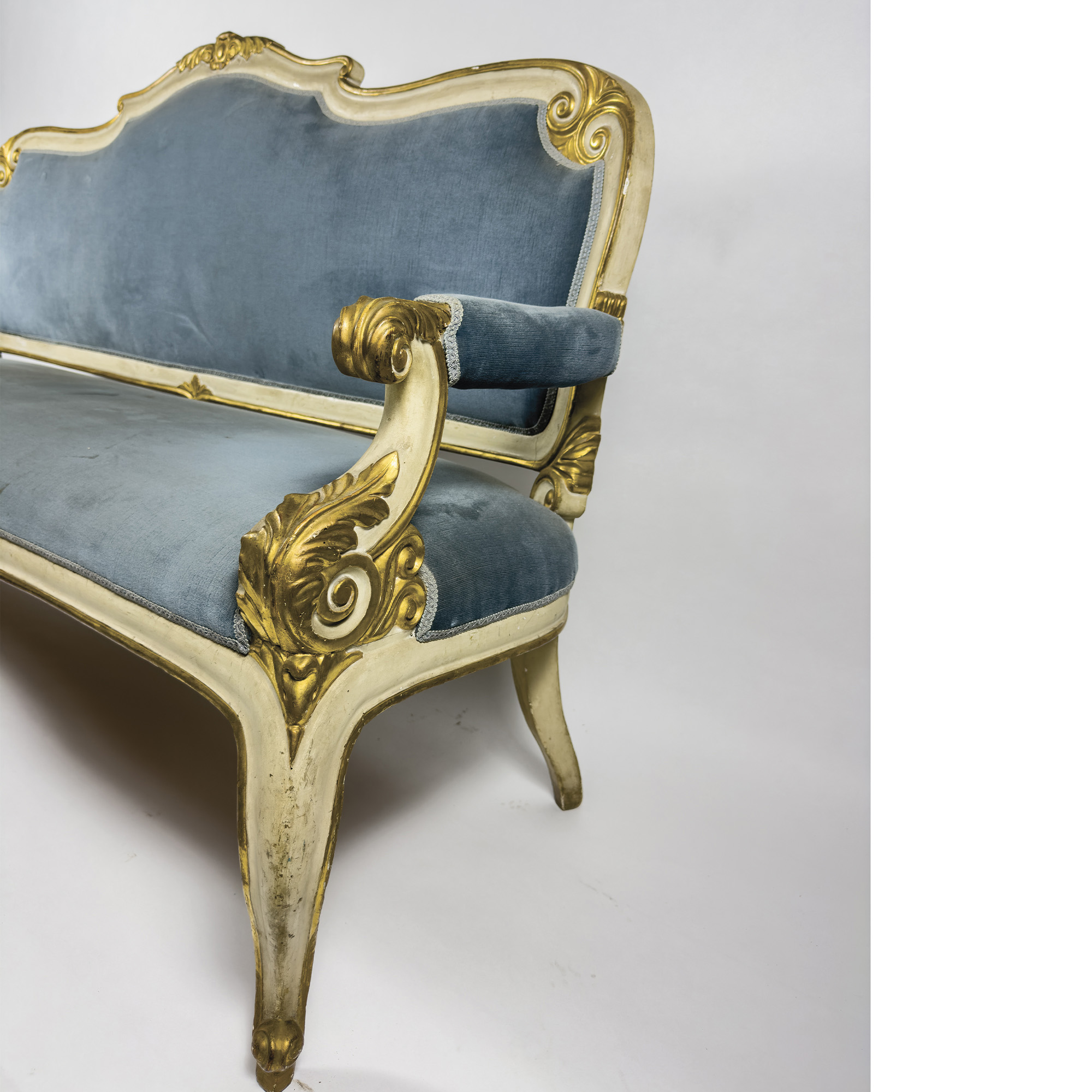 Servizio da salotto in legno laccato e dorato, Napoli XVIII secolo, composto da un divano, tre poltrone e due sedie. Struttura lignea sagomata; braccioli e montanti a voluta evidenziata da una foglia d'acanto resa in lieve rilievo; gambe mosse; quella anteriori desinenti in un ricciolo di voluta, il divano cm. 112x180x60 (il divano con difetto a una gamba; riprese alla laccatura e alla doratura)