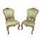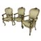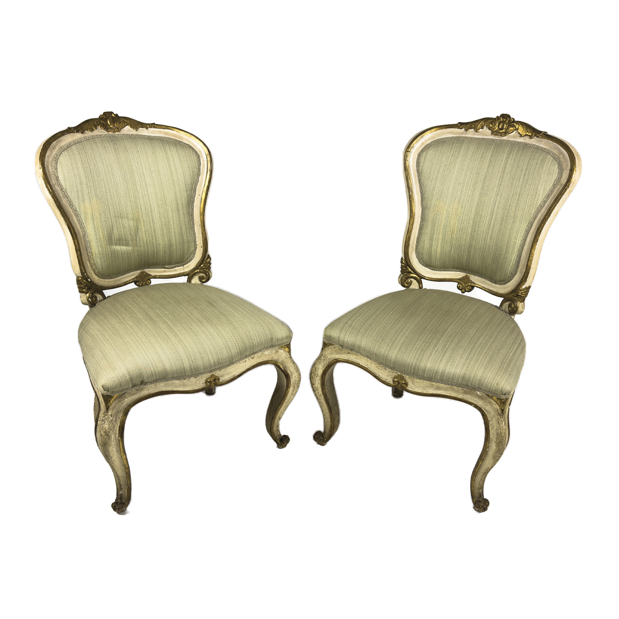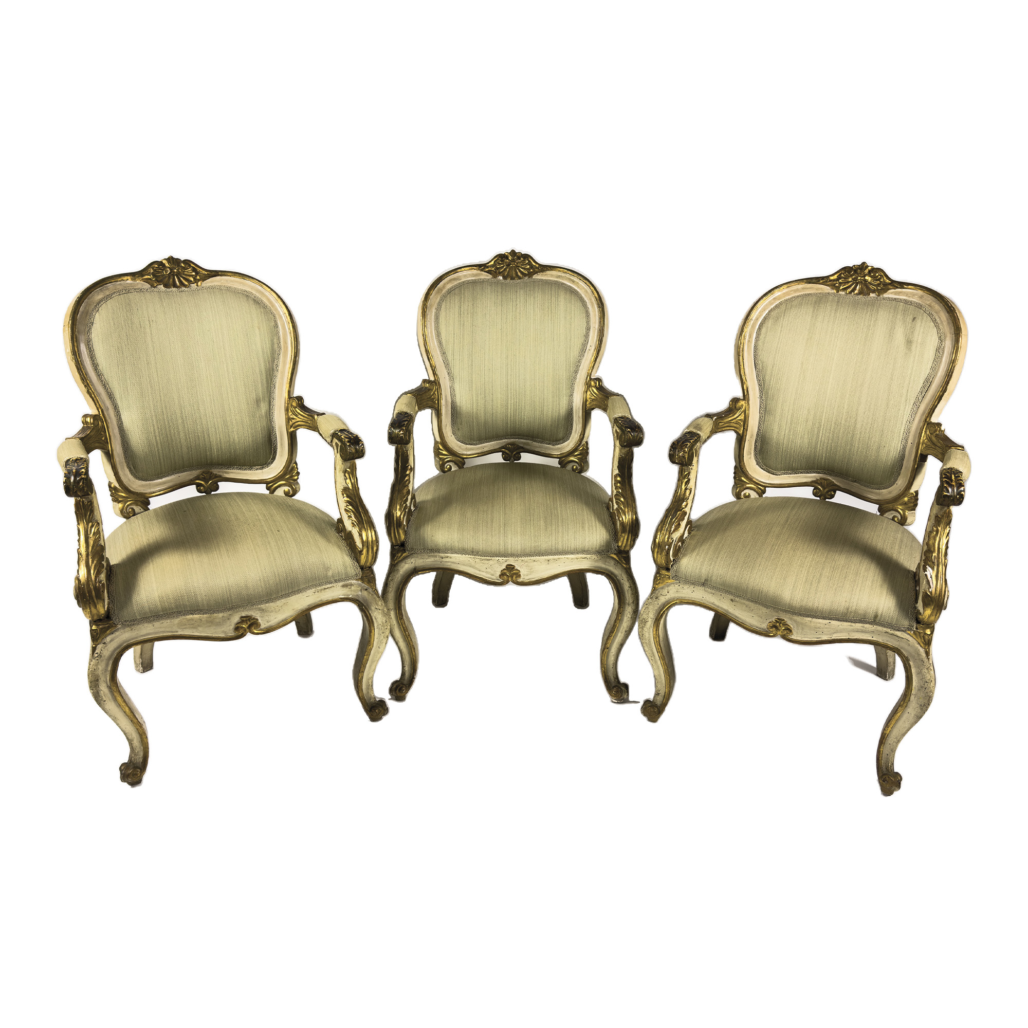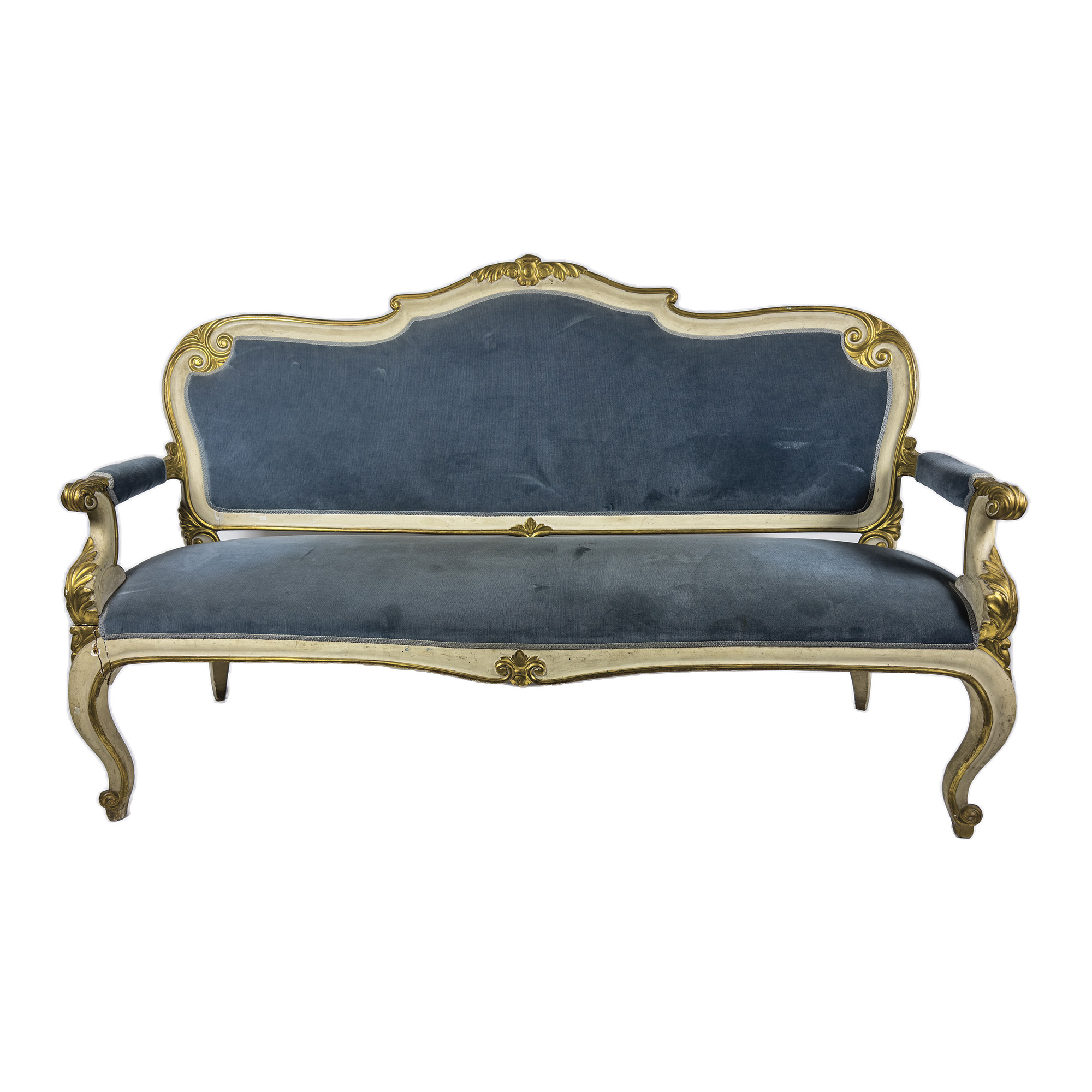 Servizio da salotto in legno laccato e dorato, Napoli XVIII secolo, composto da un divano, tre poltrone e due sedie. Struttura lignea sagomata; braccioli e montanti a voluta evidenziata da una foglia d'acanto resa in lieve rilievo; gambe mosse; quella anteriori desinenti in un ricciolo di voluta, il divano cm. 112x180x60 (il divano con difetto a una gamba; riprese alla laccatura e alla doratura)