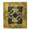 Tavolino da salotto in travertino placcato in marmo giallo, con piano intarsiato a scacchiera in marmi policromi, cm. 58x67x58