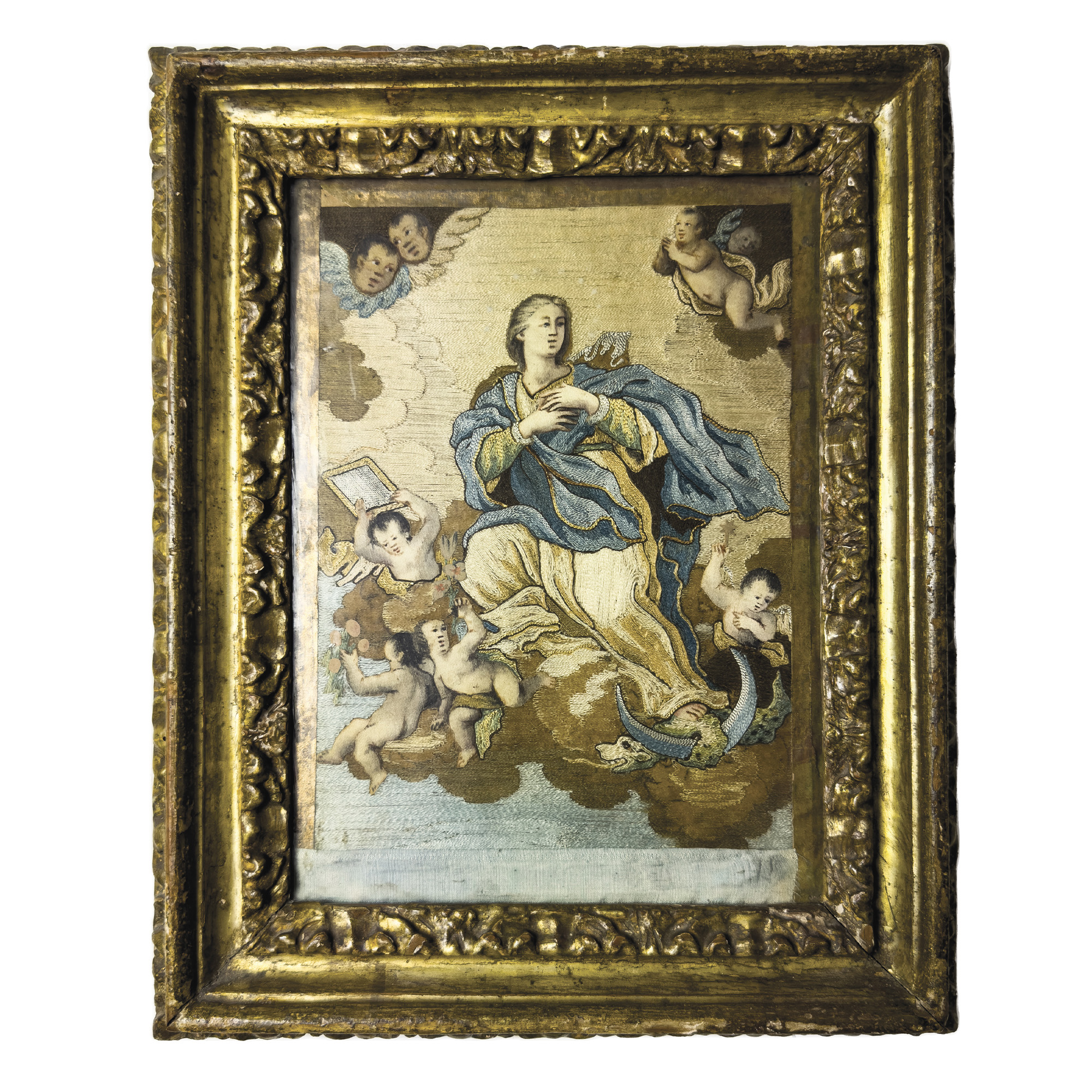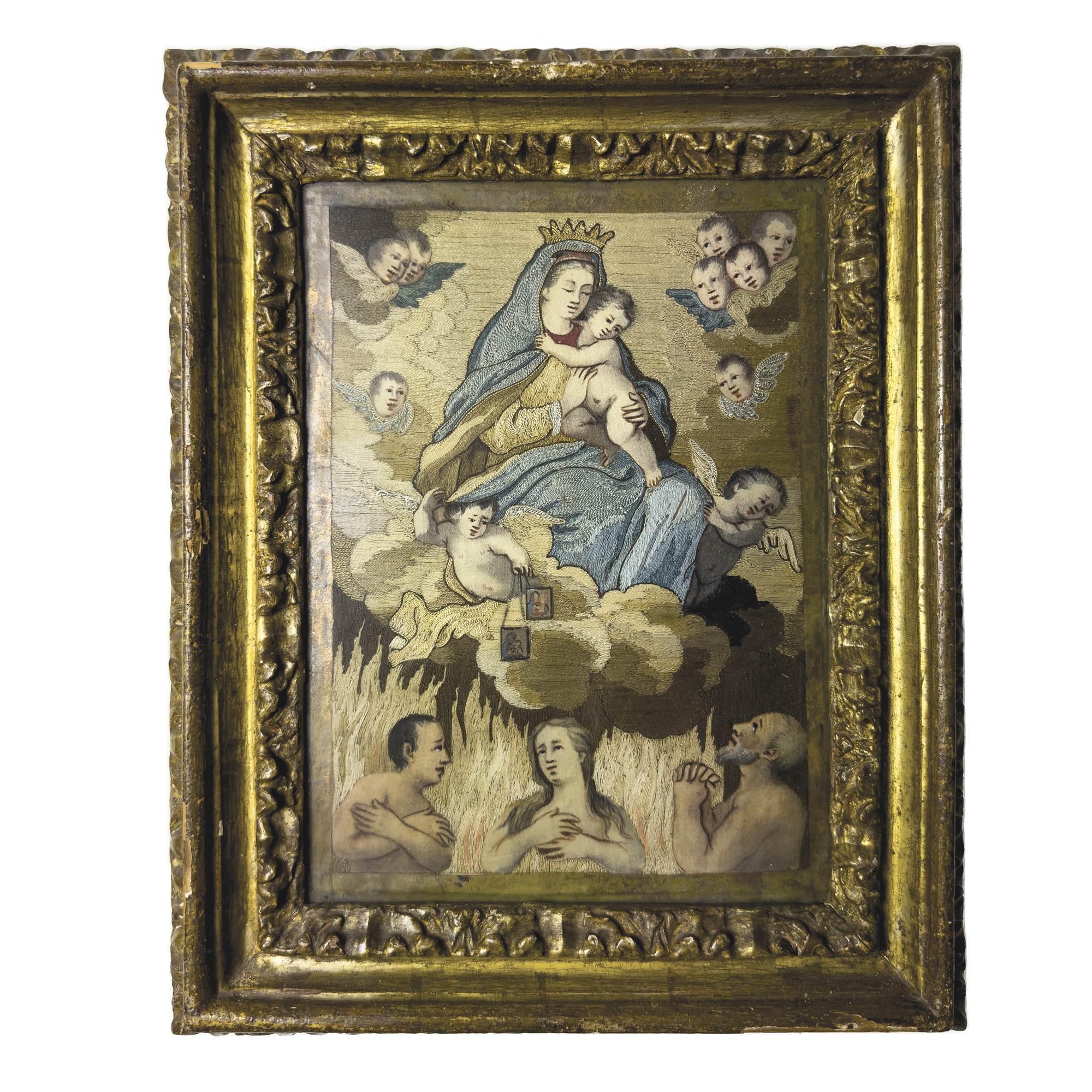 Coppia di ricami in fili di seta policromi Napoli, fine del XVIII-inizi del XIX secolo, raffiguranti rispettivamente l'Assunzione di Maria e la Madonna del Carmine; entro belle cornici di legno dorato a mecca, complessivamente cm. 39x31,5
