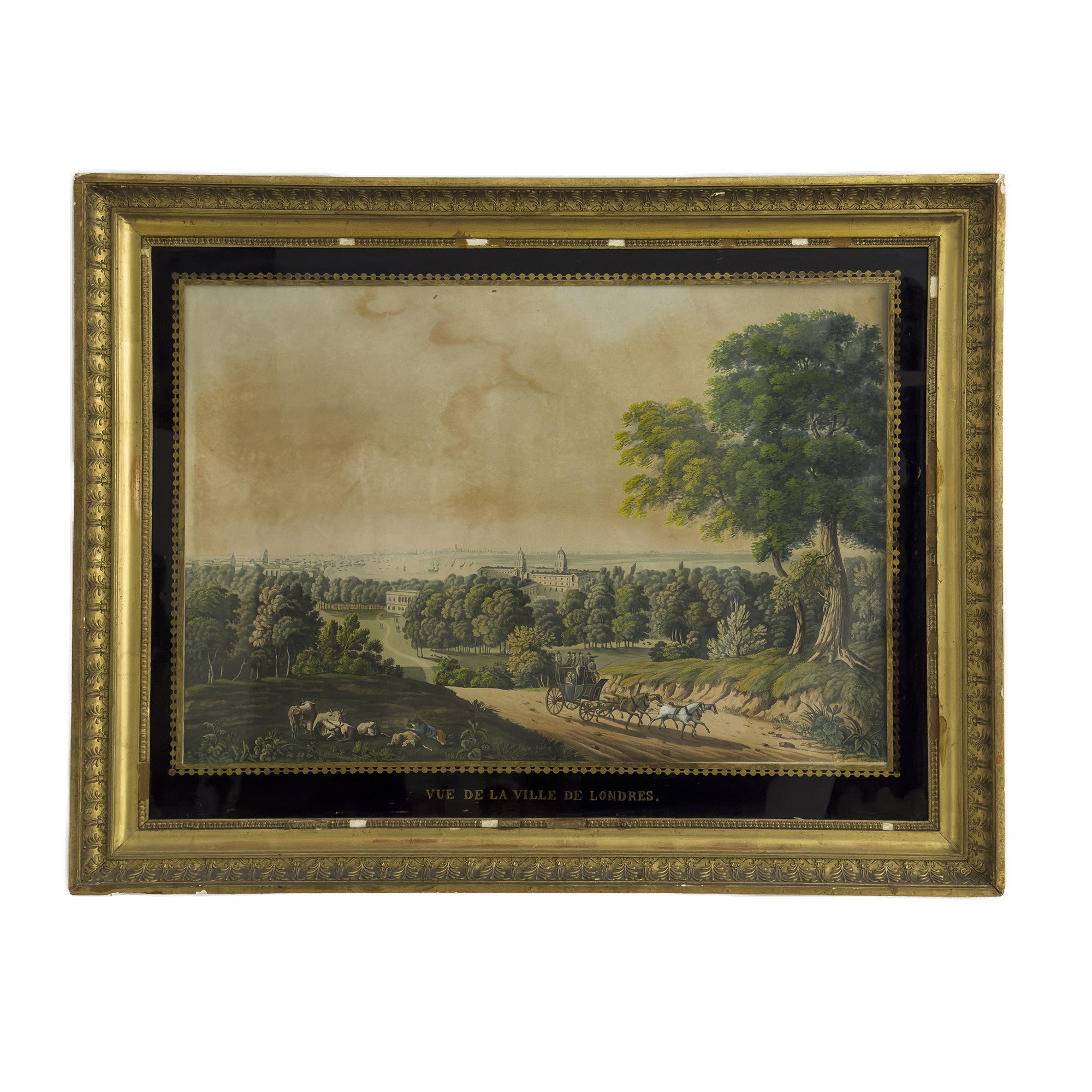 Veduta della città di Londra, fine del XVIII-inizi del XIX secolo, delineata acquarellata, cm. 60x83; vetro églomisé