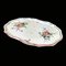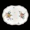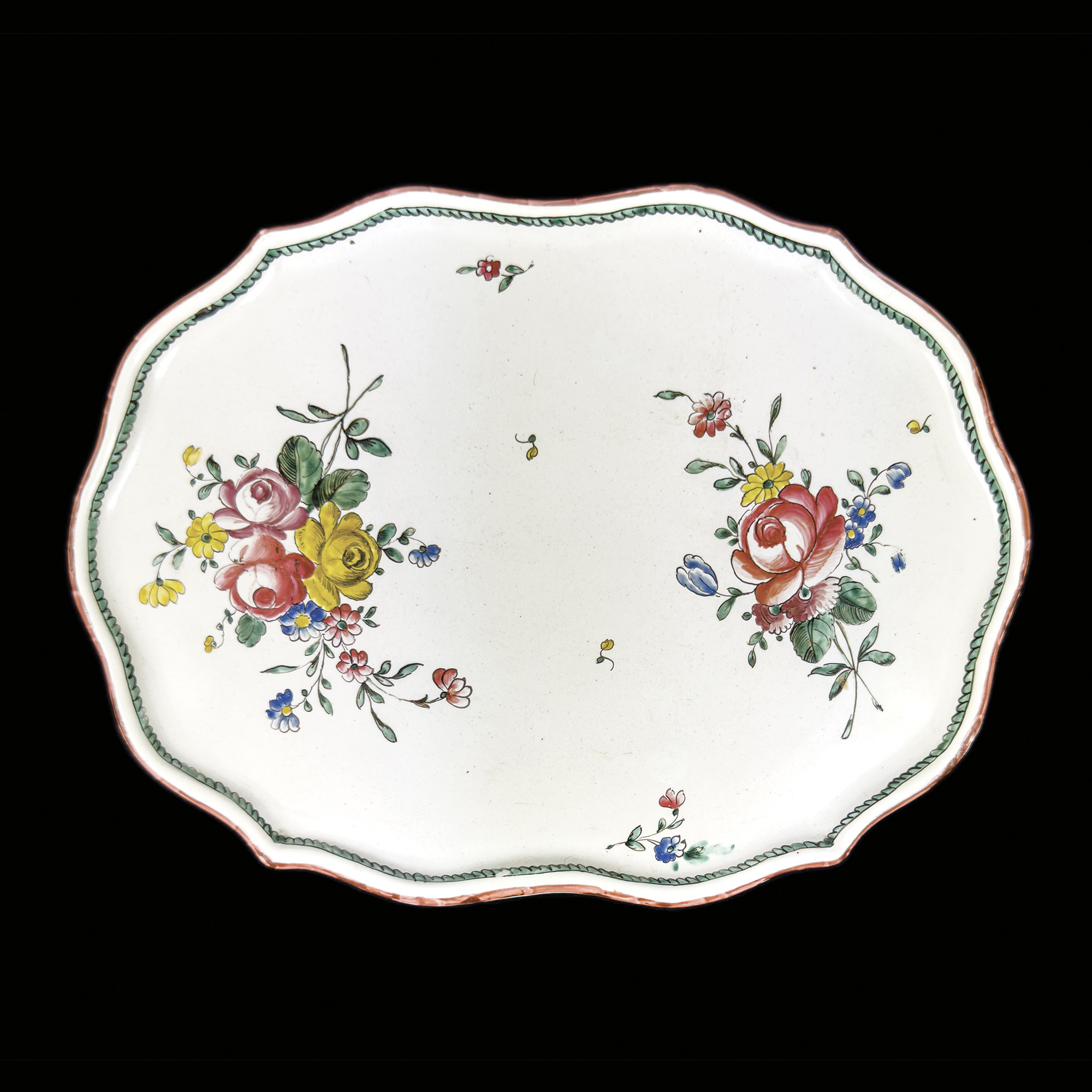 Alzatina in maiolica, Sassuolo, XVIII secolo, con cavetto ovale dipinto in policromia su fondo bianco a composizioni floreali sparse; profilo polilobato sottolineato da una cornicetta in verde a motivi fogliati stilizzati ricorrenti; piede ovale, cm. 4x25x18