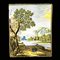 Placca in maiolica, Castelli, XVIII secolo, bottega dei Grue, di forma rettangolare dipinta in policromia a raffigurare un paesaggio fluviale alberato con piccoli borghi e figure in primo piano, cm. 27x21,5