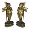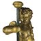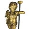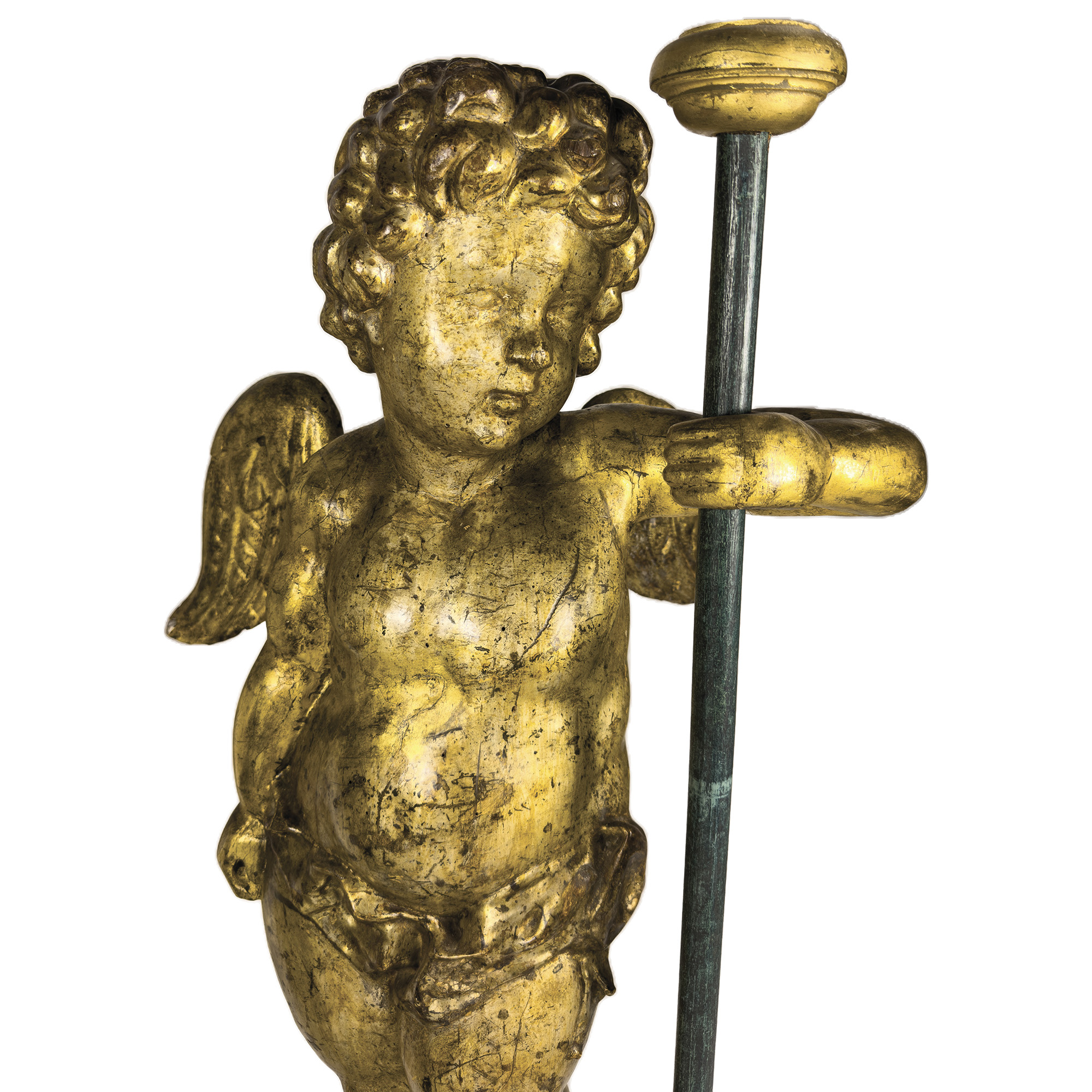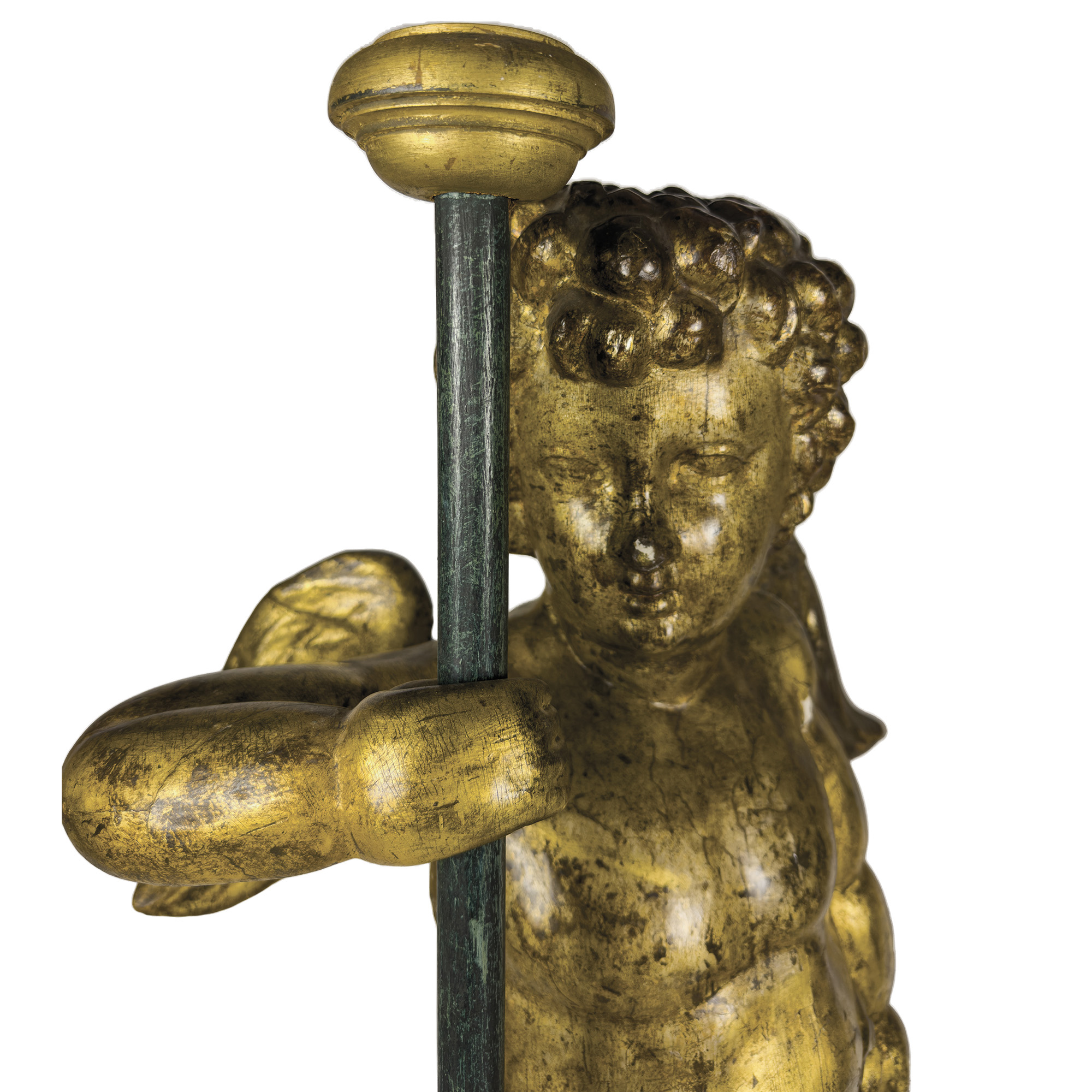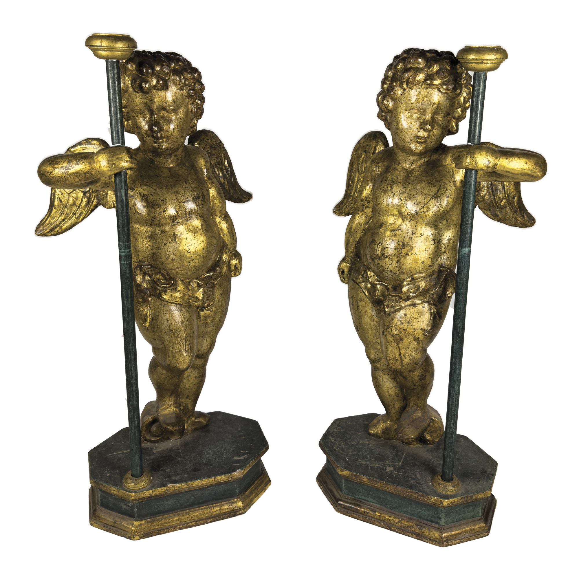 Coppia di putti alati in legno dorato a mecca, Napoli, XVII secolo, scolpiti a tuttutondo per essere disposti vis à vis: il volto paffuto incorniciato da una folta capigliatura riccioluta; la nudità coperta da un drappo panneggiato annodato su un fianco. Poggianti su basi ottagonali a finto marmo di epoca successiva, complessivamente h. cm. 105