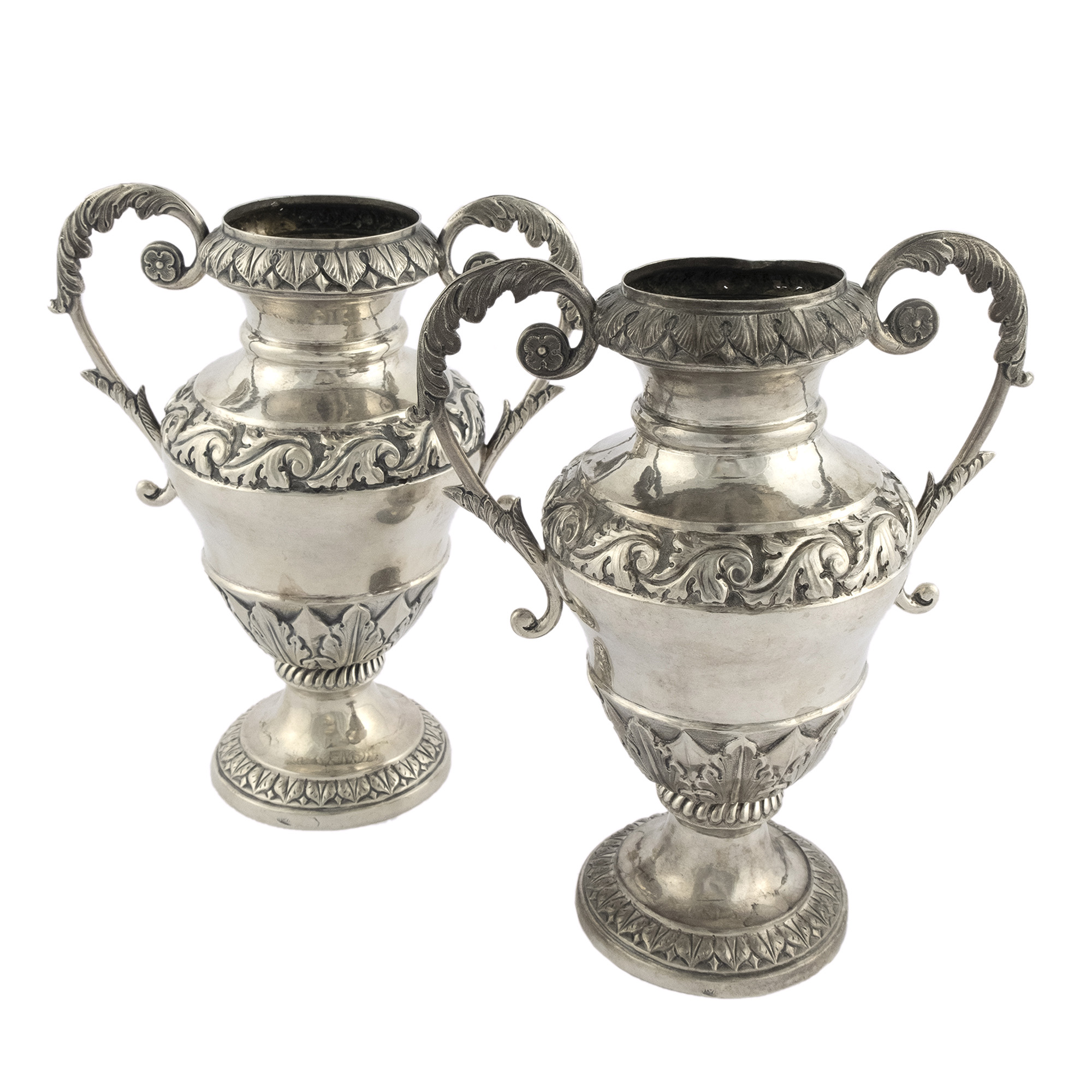 Coppia di vasetti portapalma biansati in argento, Napoli, XIX secolo, sbalzati a fascia fogliata, la parte inferiore del corpo a sequenza di foglie lanceolate; piede circolare, punzone testina di partenope N8, h. cm. 19, peso complessivo gr. 545