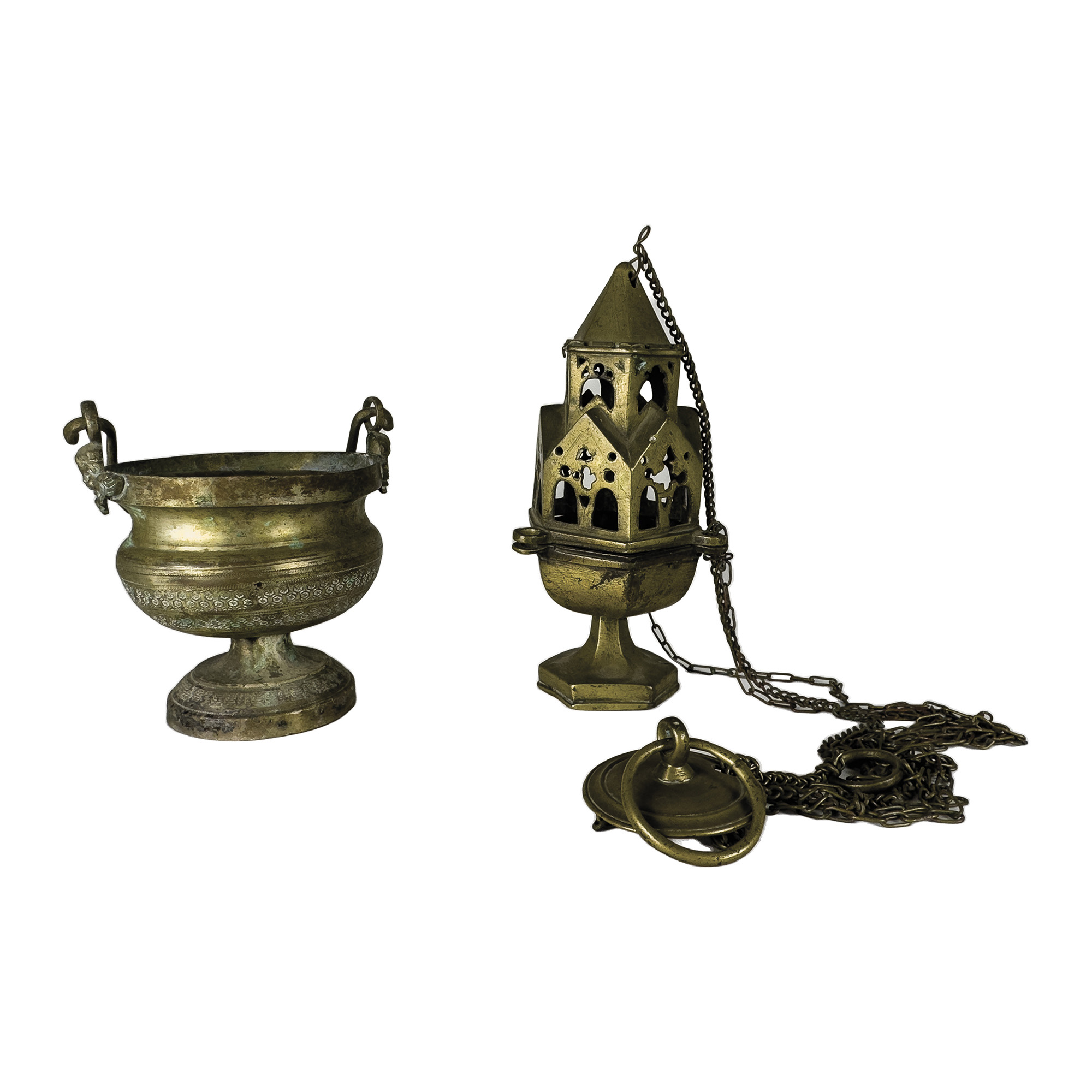 Incensiere e aspersorio in bronzo e in metallo dorato, di diversa epoca e manifattura, h. cm. 22; cm. 12x12 (qualche difetto)