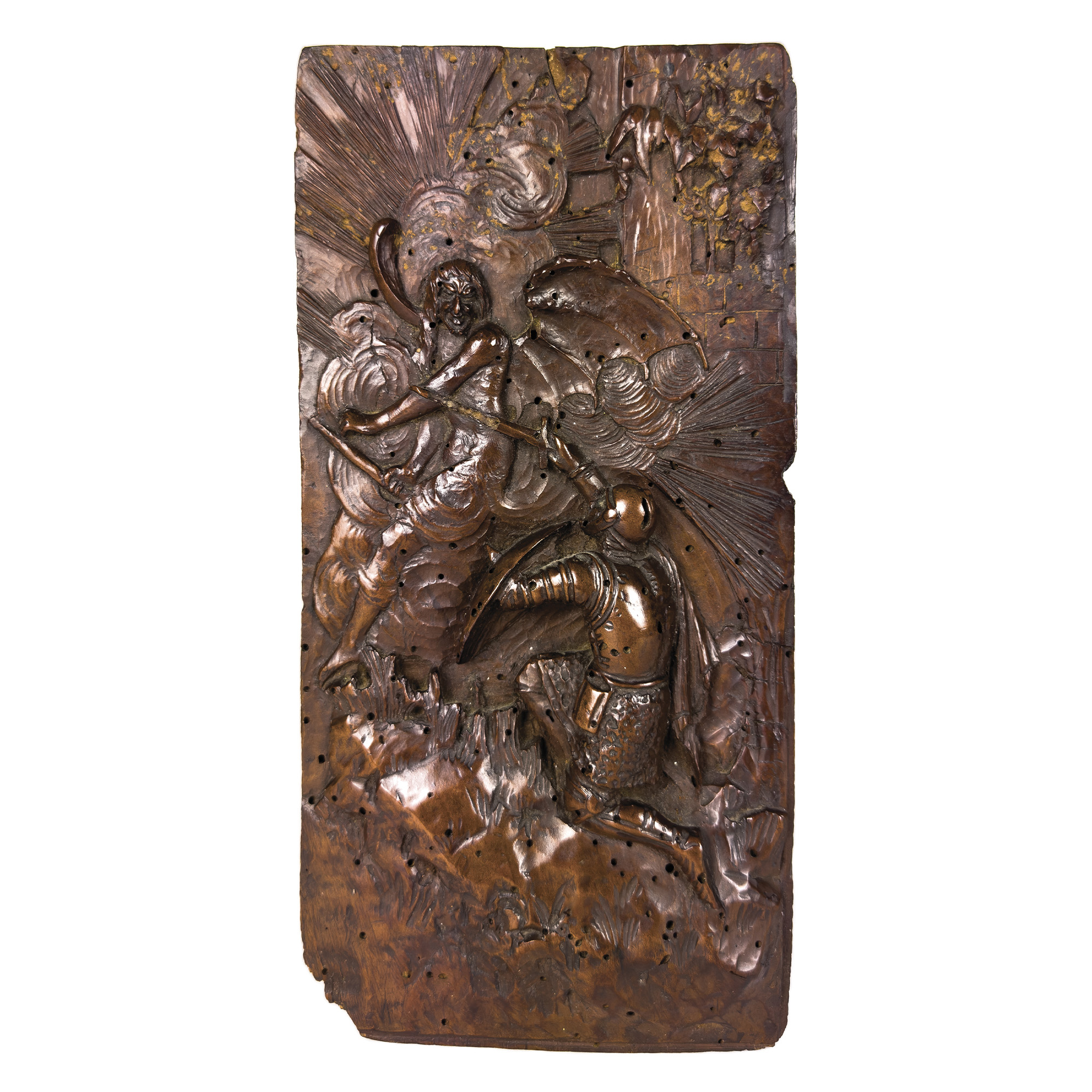 Formella in bosso, Veneto, XVIII secolo, scolpita ad altorilievo a raffigurare un guerriero che combatte contro un demone, cm. 27x13,3