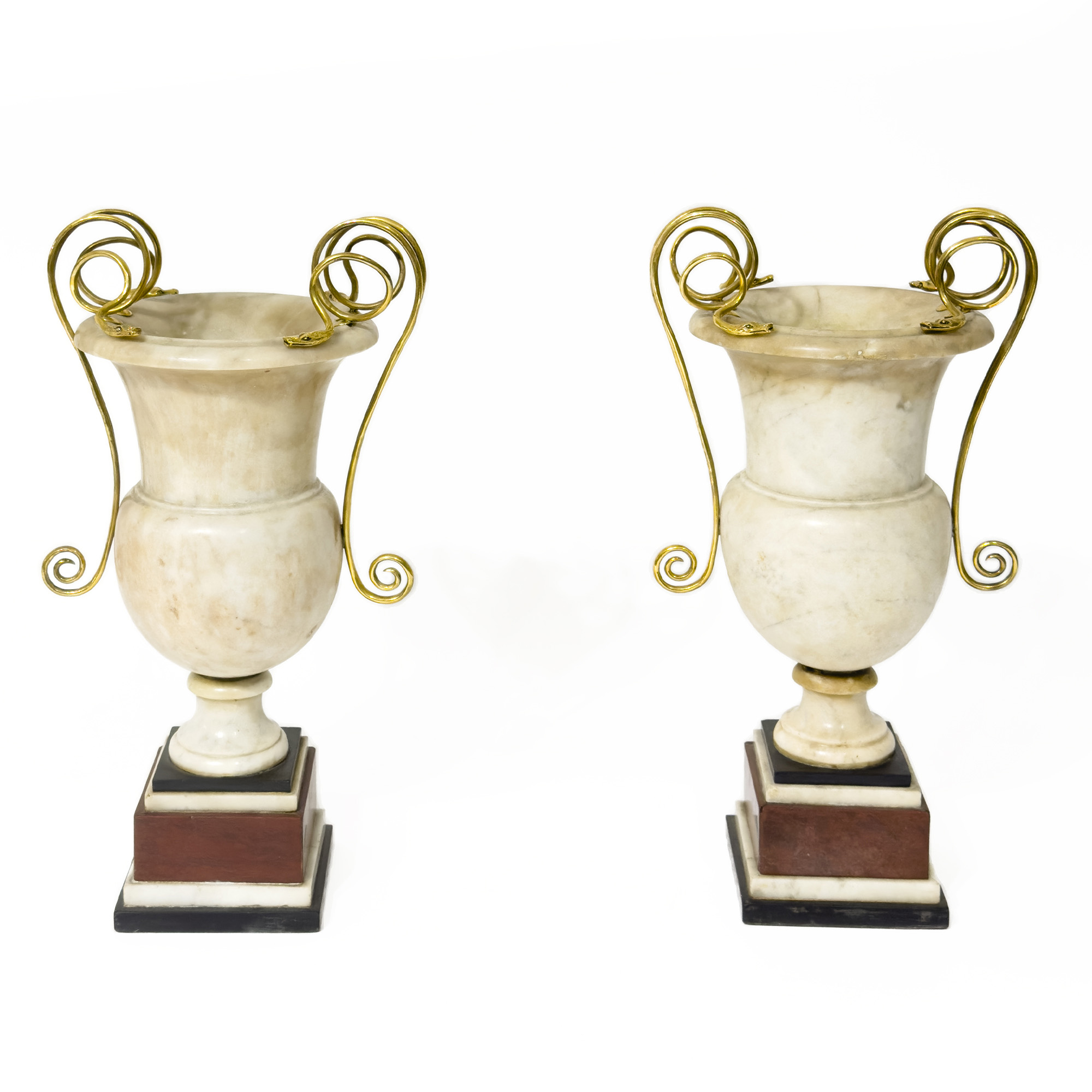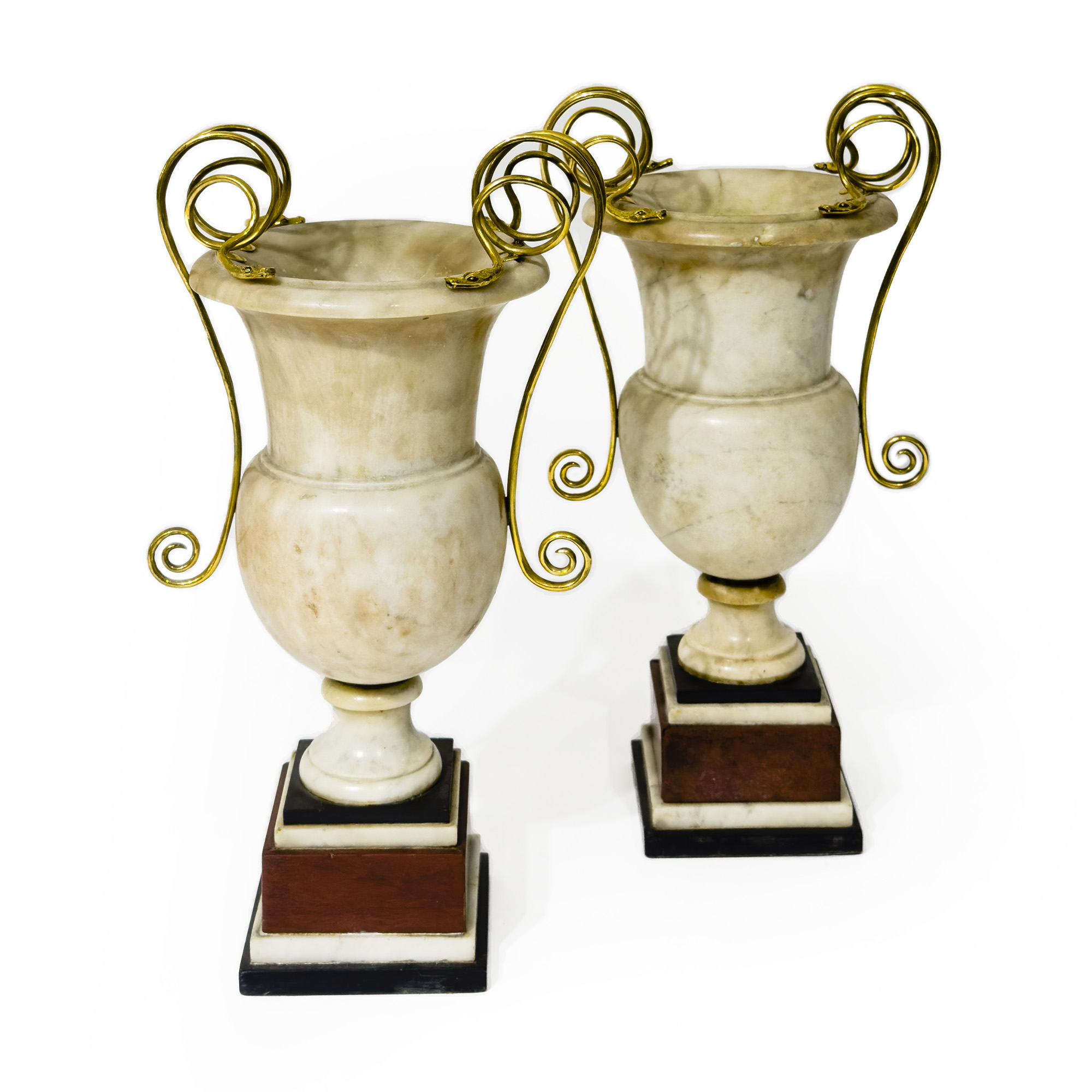 Coppia di anforette in marmo bianco, Roma, 1790-1820, corpo a balaustro su piede quadrato in marmo nero e rosso; due anse in bronzo dorato modellate a serpi stilizzate, h. cm. 33