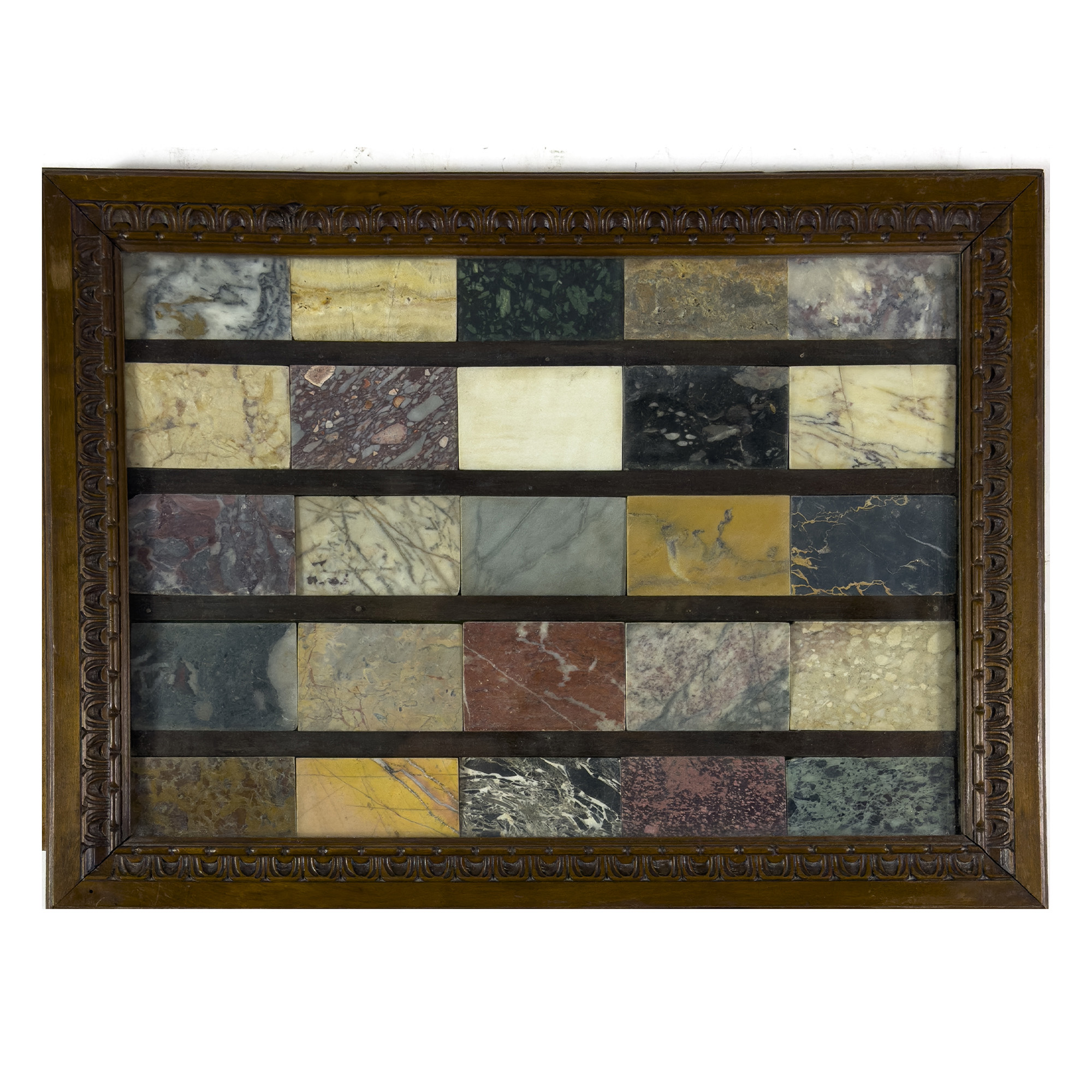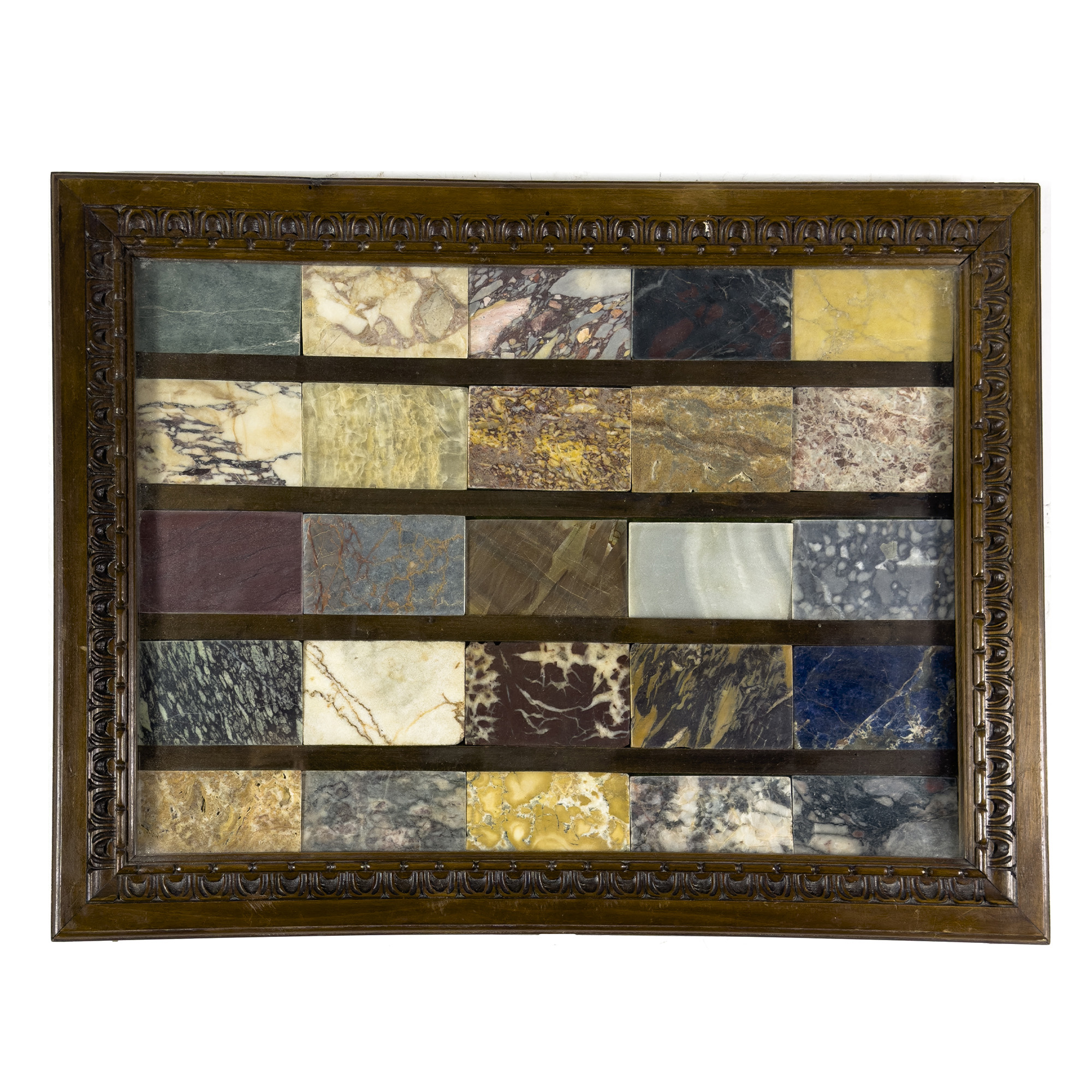 Coppia di campionari di marmi, fine del XIX secolo, ciascuno comprendente 25 formelle di differente varietà; entro cornice a teca, complessivamente cm. 45x60