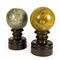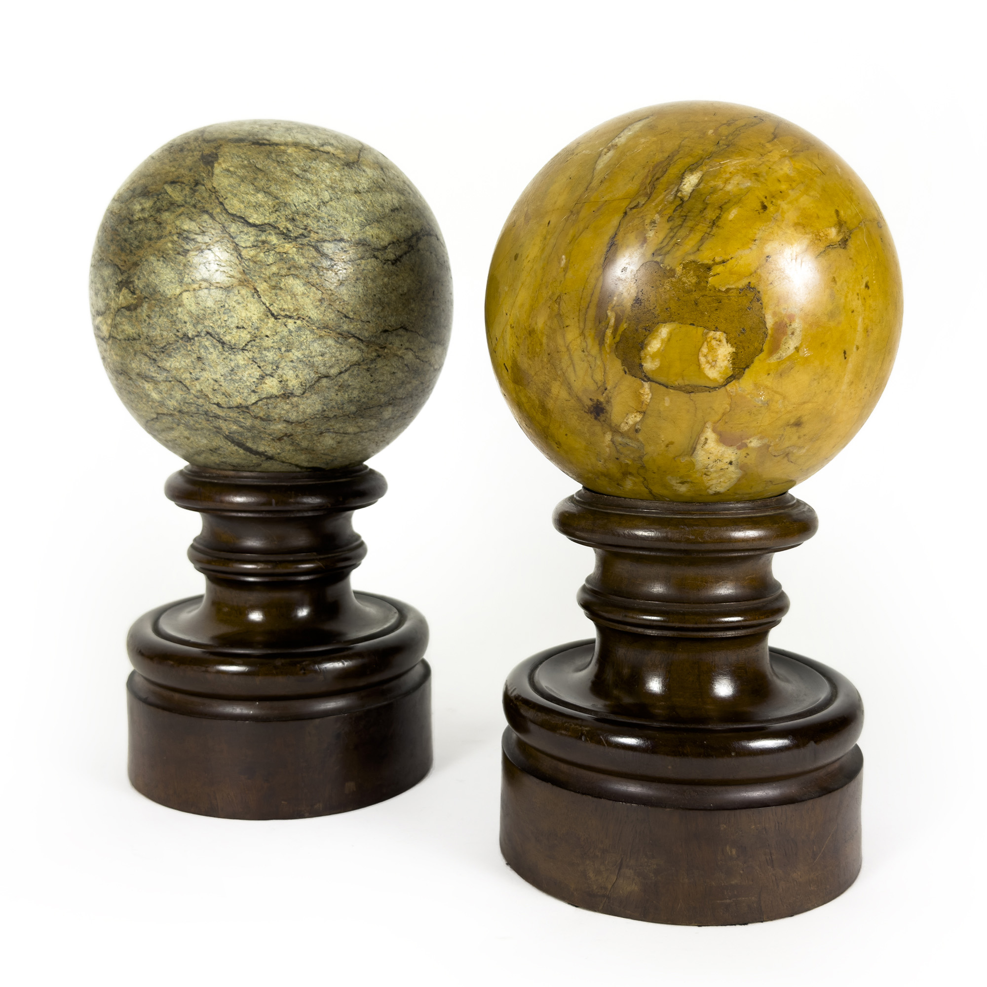 Due sfere in marmo giallo antico e serpentino marino, XIX secolo, poggianti...