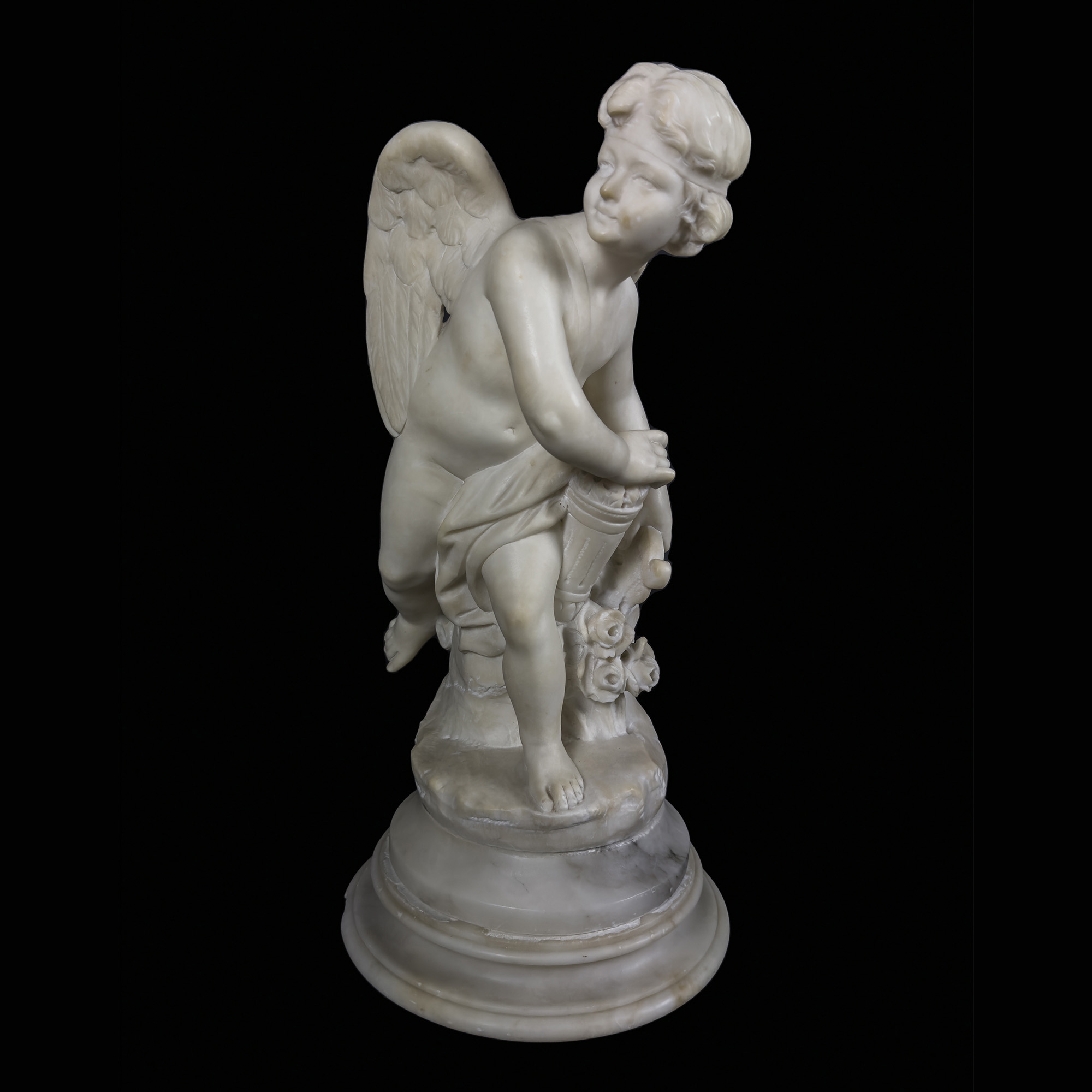 Figura di Cupido in alabastro, fine del XIX secolo, su base circolare,...