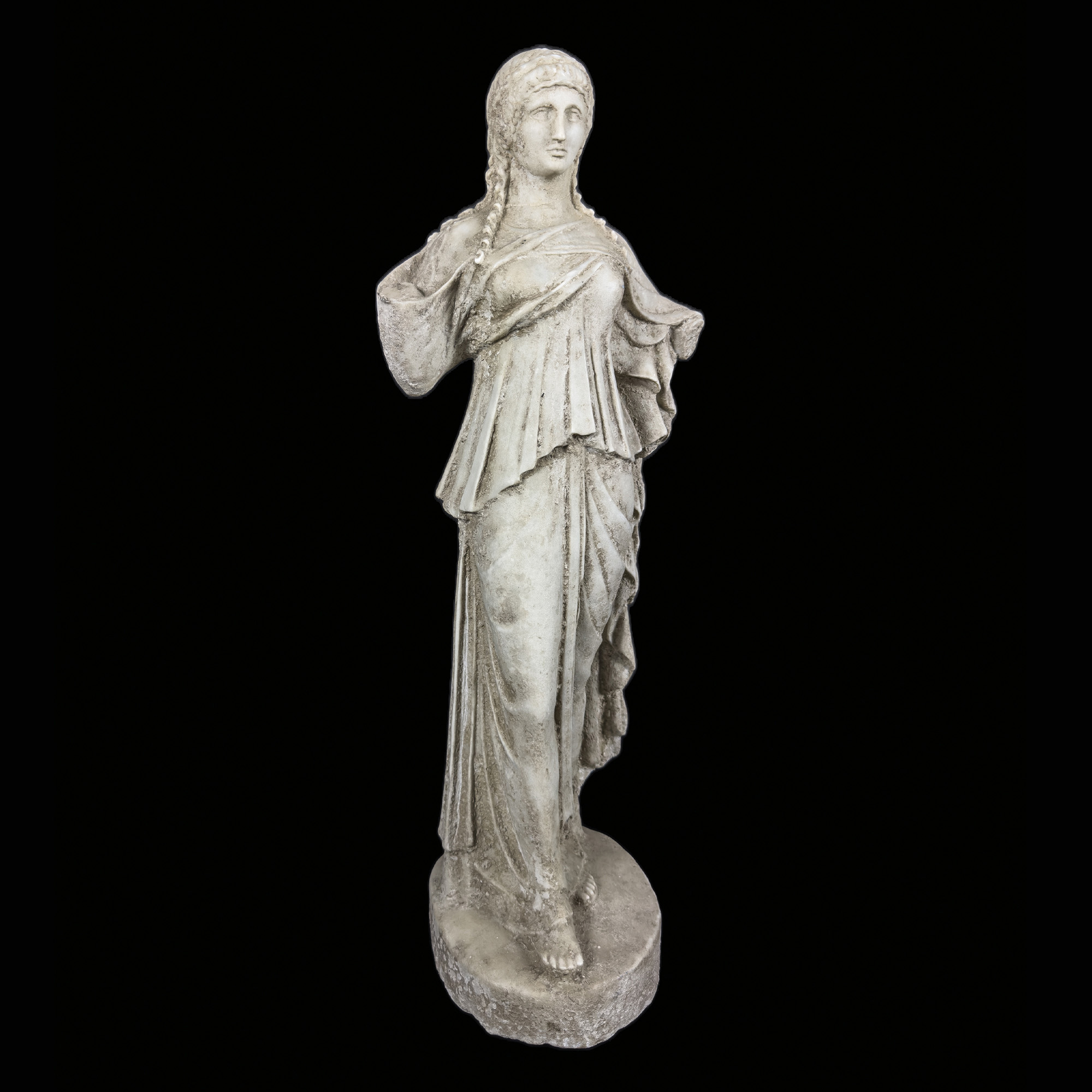 Figura di vestale in marmo bianco, XIX secolo, con i capelli raccolti in una lunga coda, h. cm. 73