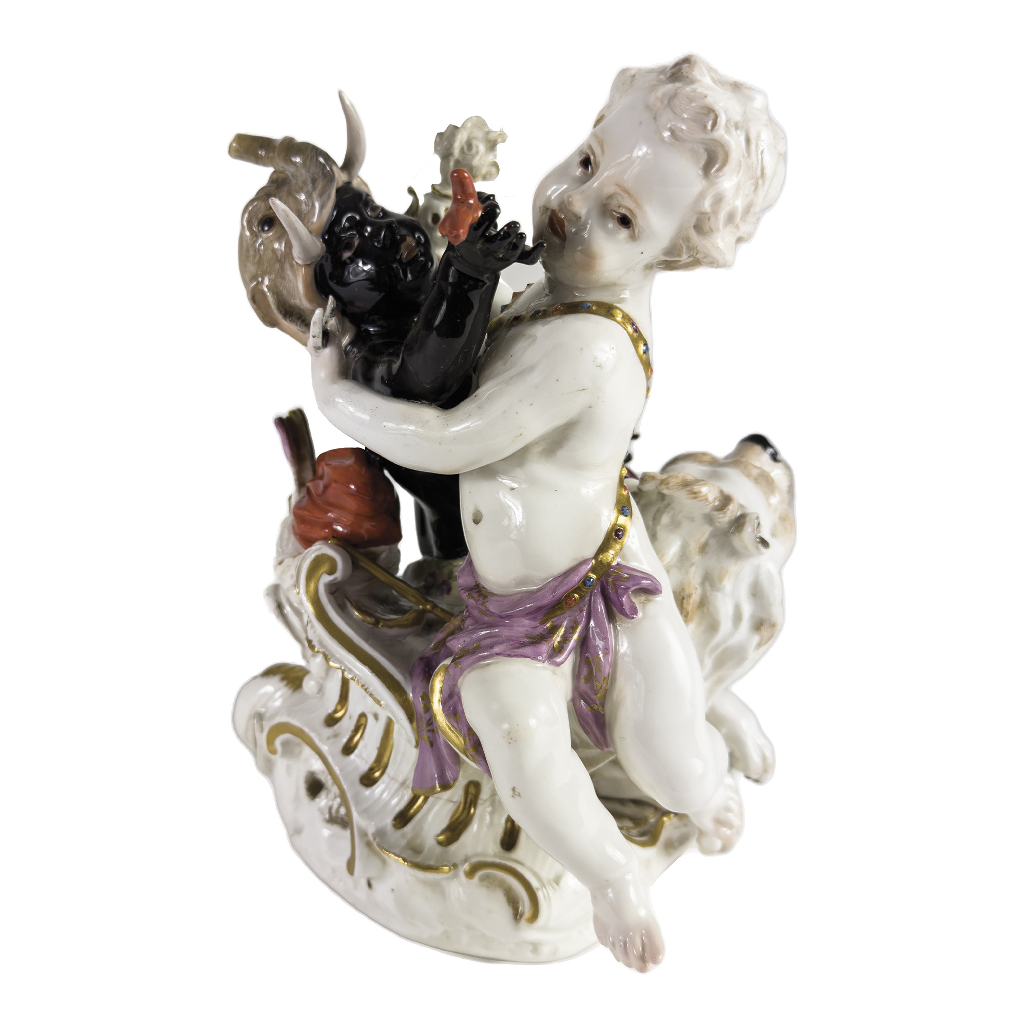 Gruppo in porcellana bianca e policroma raffigurante l'Africa, Meissen, circa 1755, marca spade incrociate in blu sotto smalto, h. cm. 23,5 circa