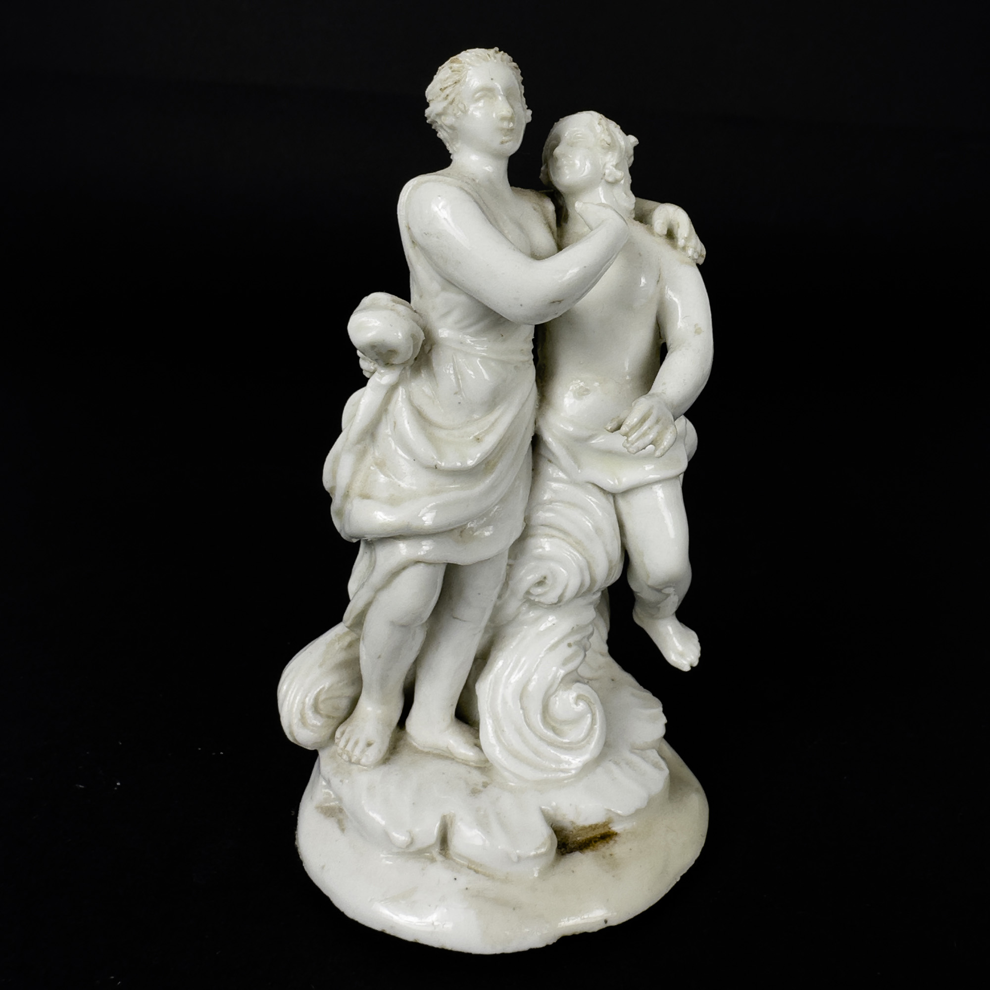Gruppo in porcellana bianca, Este, XVIII secolo, raffigurante una scena mitologica, h. cm. 11 (restauri)