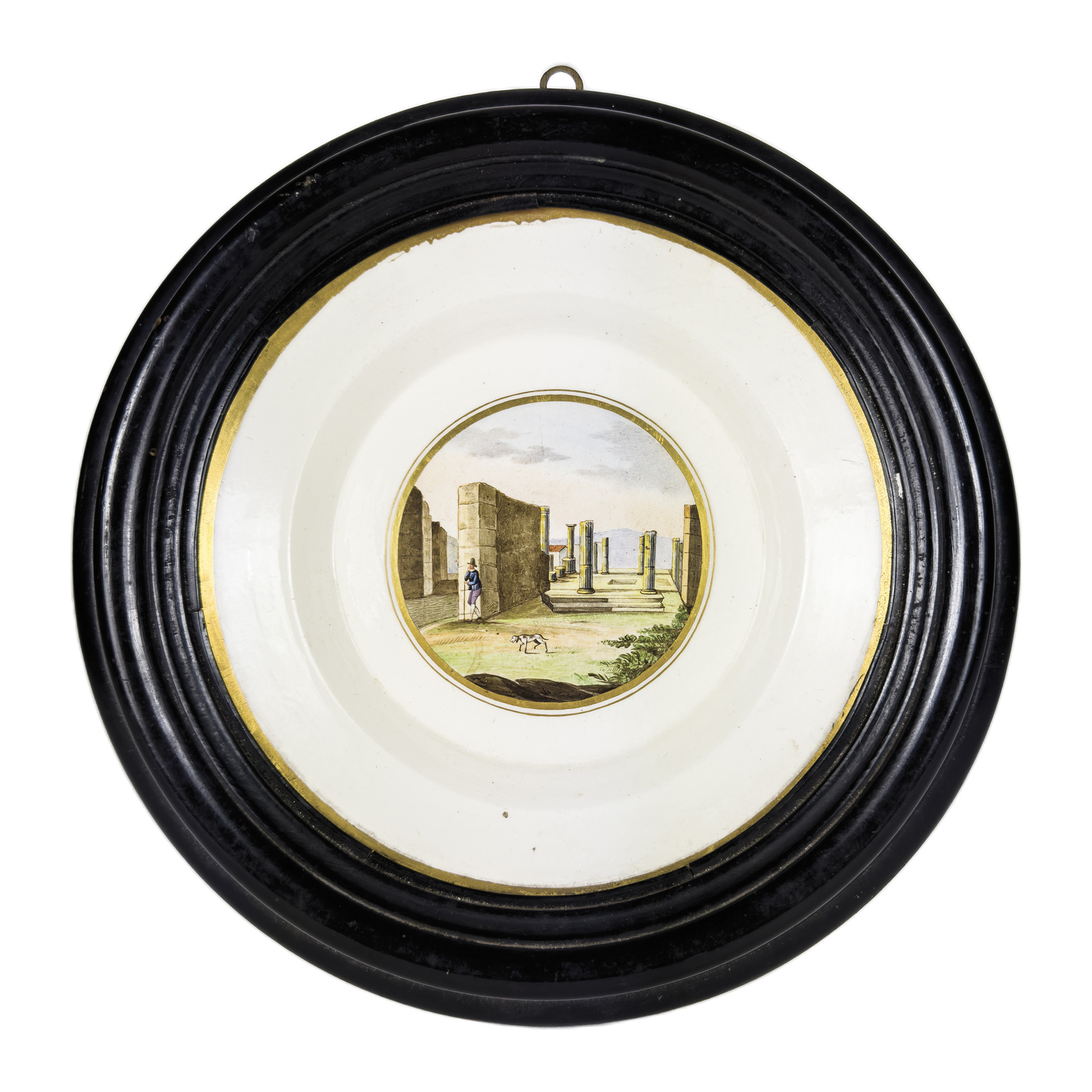 Piatto in terraglia bianca, Napoli, Manifattura Giustiniani, XIX secolo, il cavetto dipinto in policromia a raffigurare l'Interno della Casa di panza a Pompei come da iscrizione al verso, marca GG incussa, d. cm. 24; entro cornice in legno ebanizzato