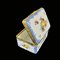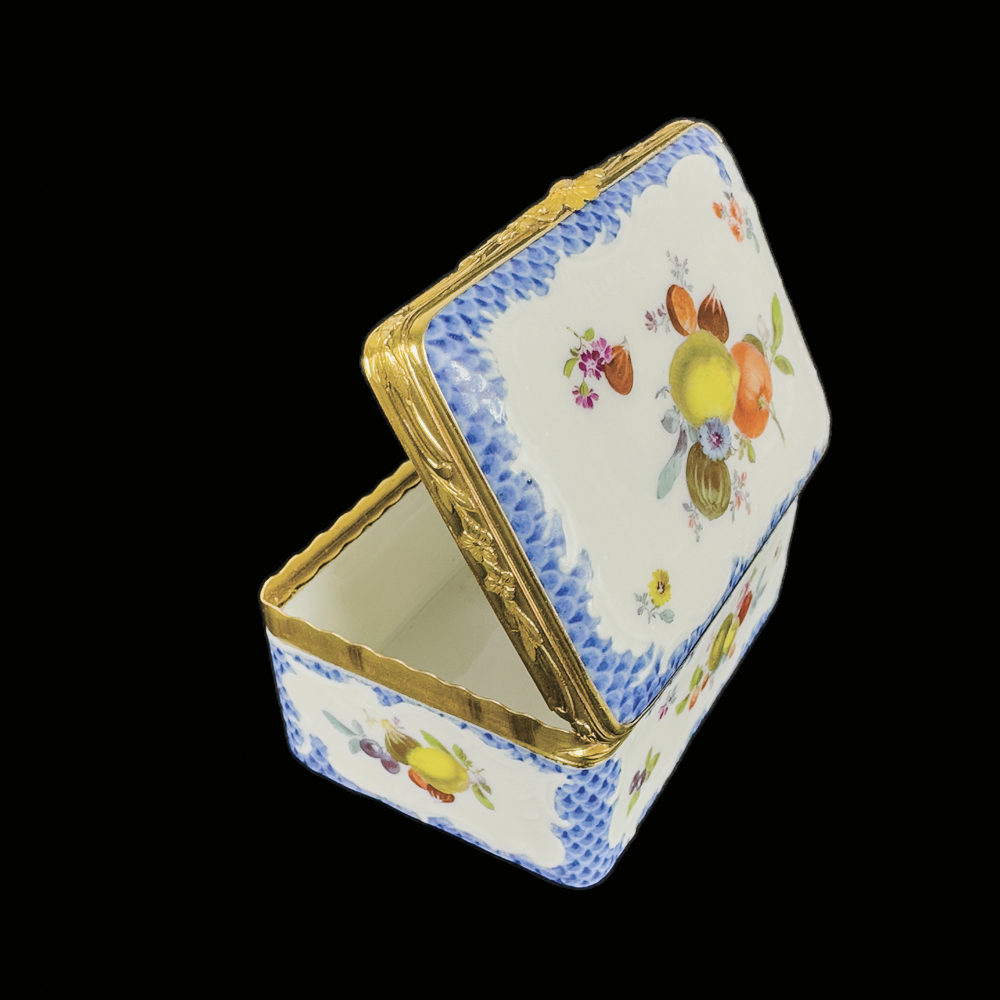 Tabacchiera in porcellana, Meissen, XVIII secolo, di forma parallelepipeda, dipinta in vivace policromia su fondo bianco a raffigurare composizioni di frutti sparse su tutta la superficie esterna; coperchio incernierato internamente ornato da una scena ispirata ai dipinti di Philips Wouverman, raffigurante due cavalieri sullo sfondo di un paesaggio fluviale con edifici; montatura in oro 12kt., marca assente, cm. 3,5x7x5,5