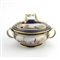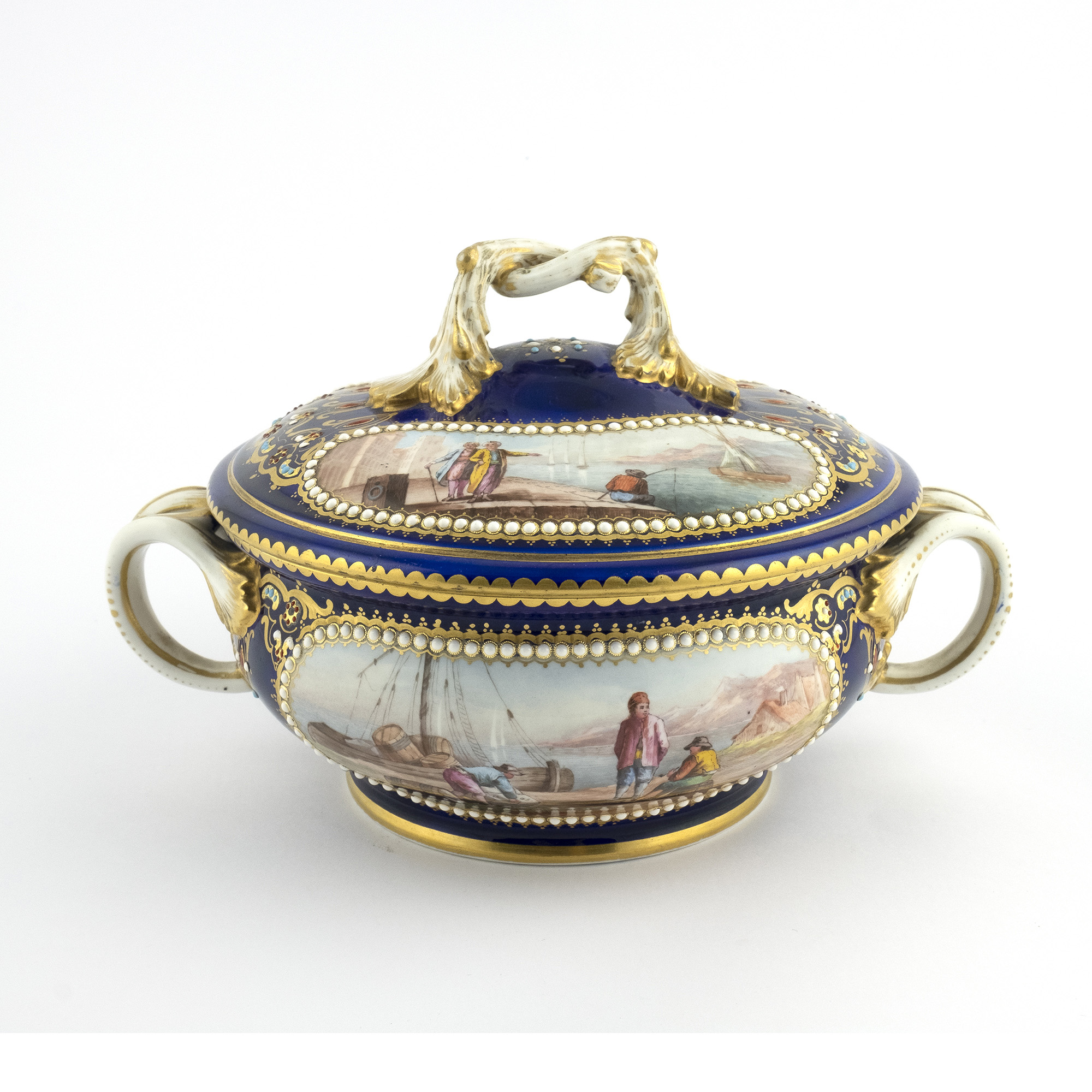 Tazza da puerpera con coperchio in porcellana, Sèvres, fine del XVIII secolo, corpo dipinto in Bleu Royale arricchito da ornati dorati: quattro riserve ovali in vivace policromia, raffiguranti scene di porto con mercanti, decorano sia il coperchio sia il corpo della tazza; anse e presa del coperchio con attacco fogliato, marca doppia L intrecciata in blu sotto smalto, cm. 13x21 manici inclusi