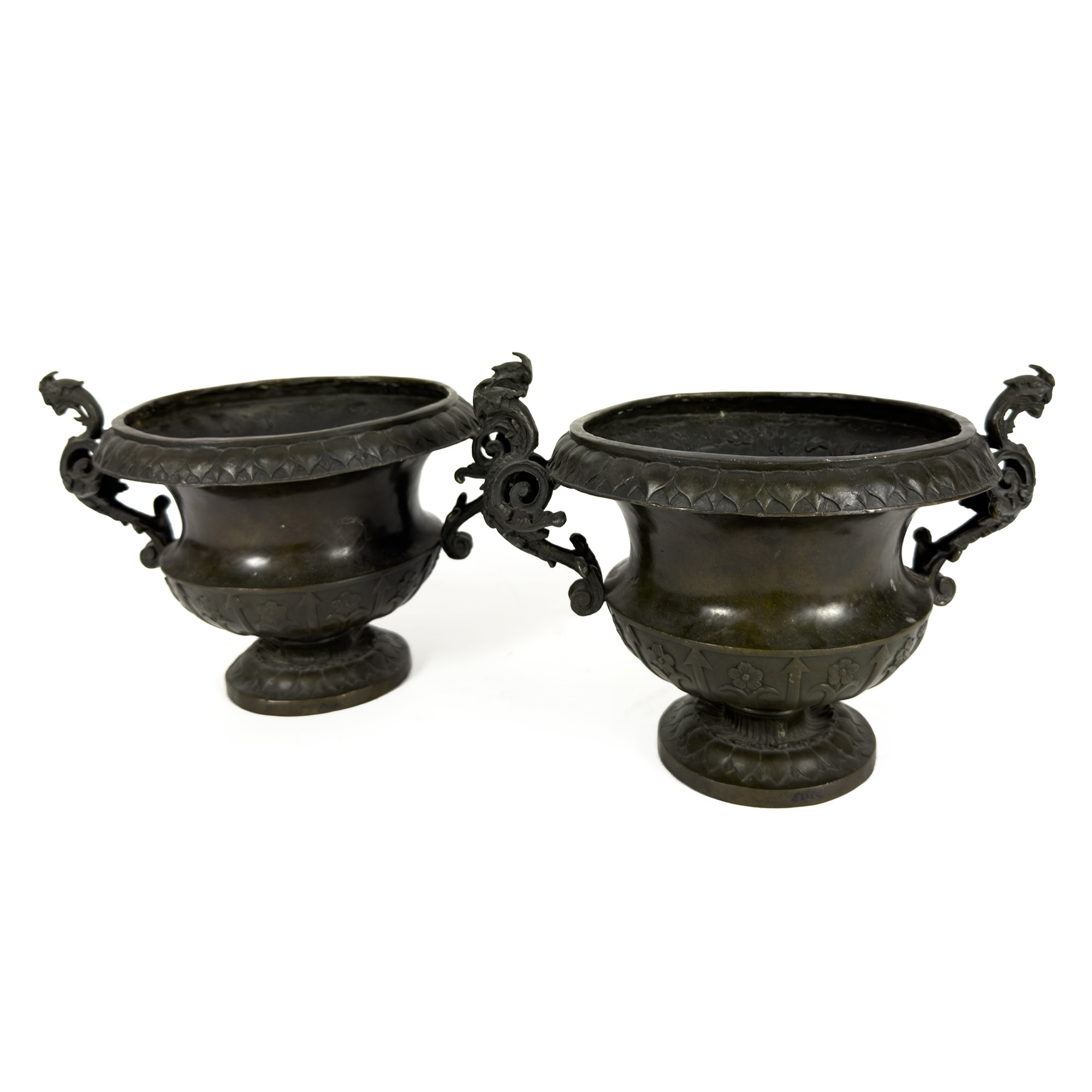 Lotto 363 | Coppia di vasi a cratere biansati in bronzo patinato, fine del XIX secolo,...