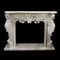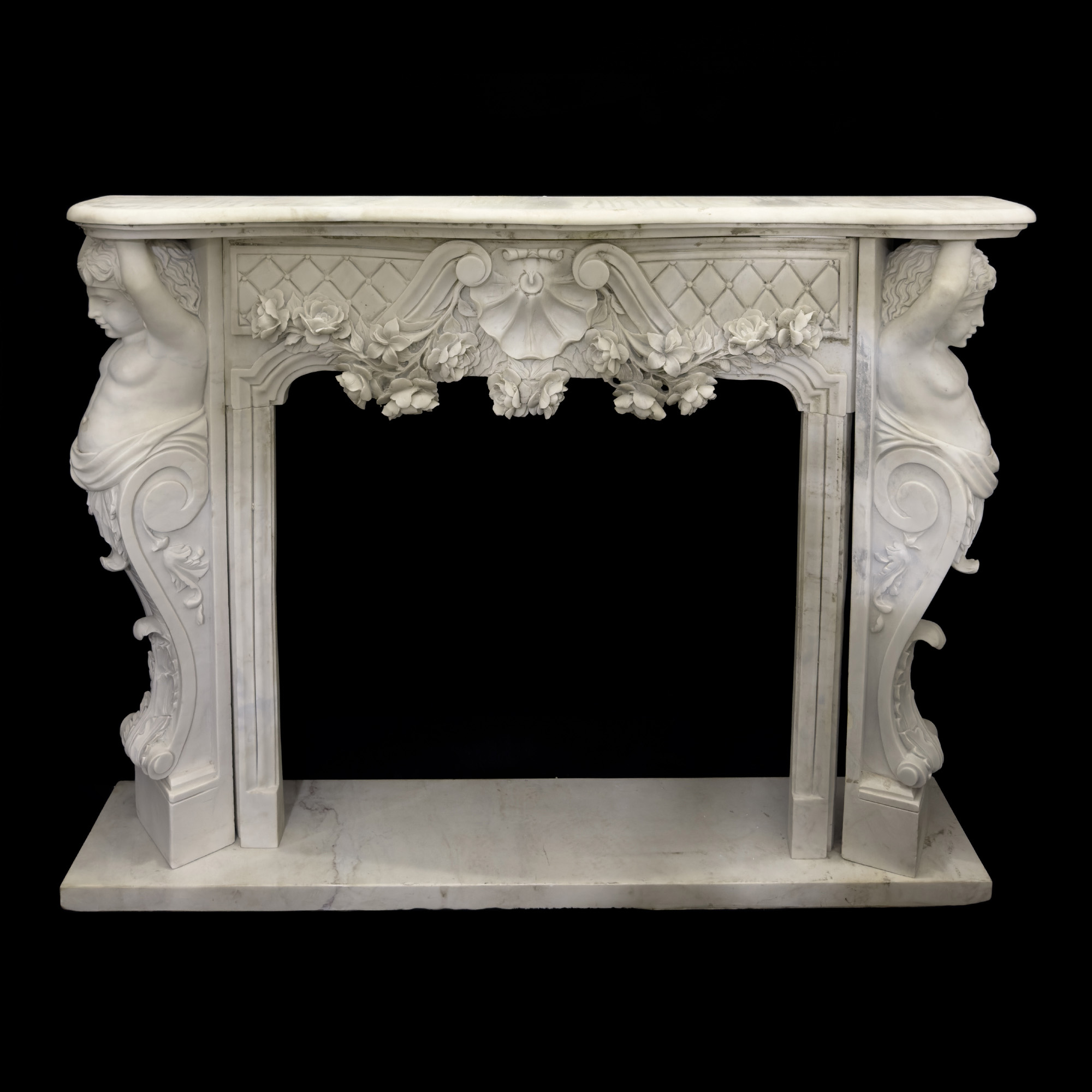 Camino in marmo bianco, architrave di linea sagomata idealmente sorretto da due erme di putto emergenti da una voluta; fascia superiore della bocca del camino con profilo scolpito a raffigurare una ghirlanda di rose trattenute al centro da una valva di conchiglia; base lineare, massimo ingombro: cm. 128x171,5x34 circa; la bocca: cm. 88x97; interno bocca: cm. 118,5x134,5x21 circa