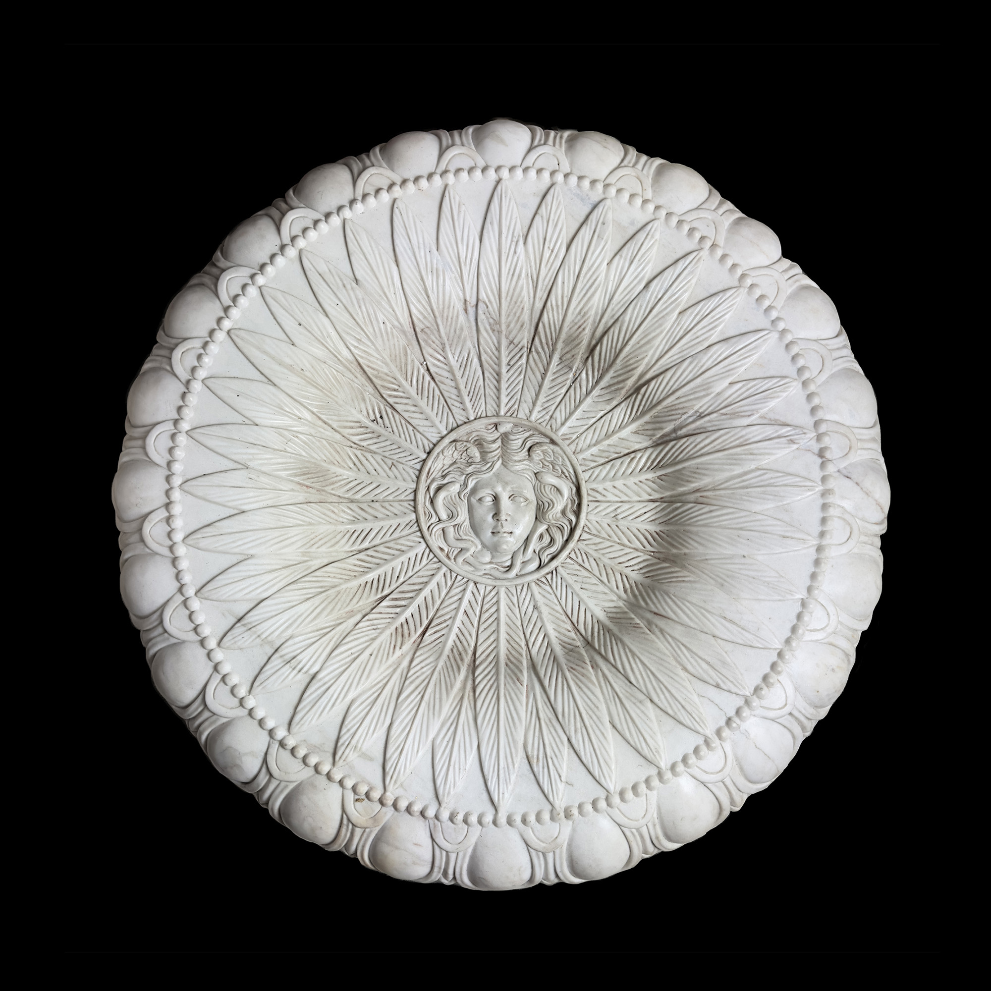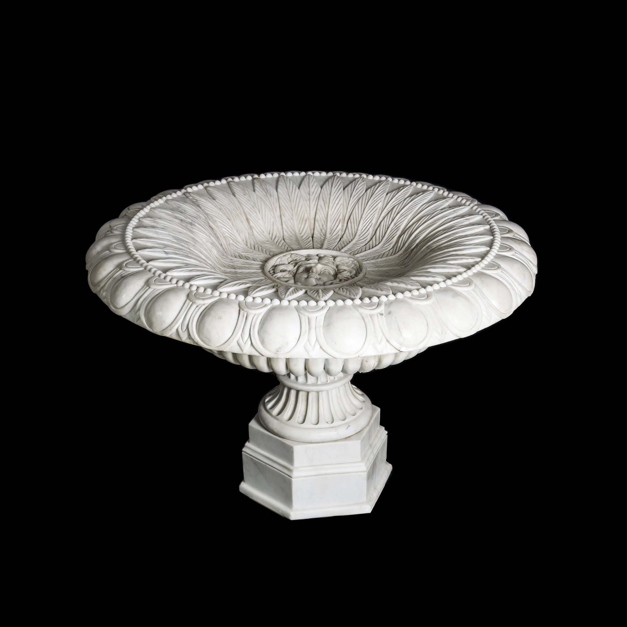 Coppia di grandi alzate in marmo bianco scolpito con vasca a corolla, al centro campeggia la testa di Medusa; piedistallo scanalato su base esagonale, cm. 60x86