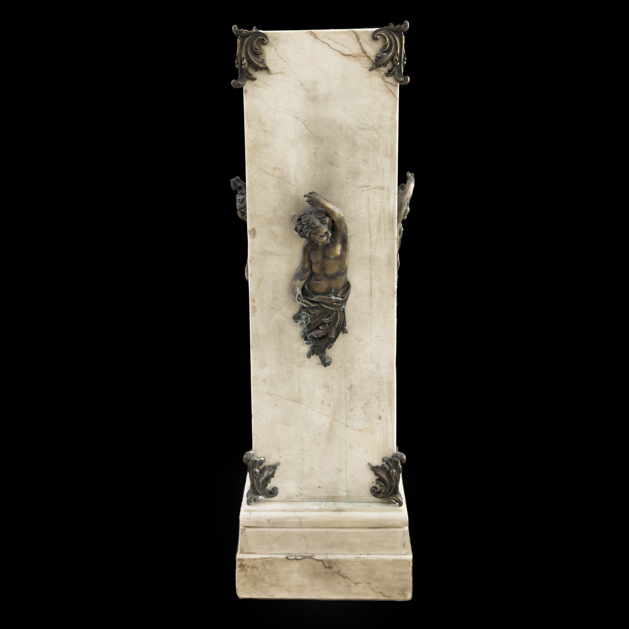Coppia di piedistalli in marmo bianco a sezione quadrata, con applicazioni in bronzo patinato che arricchiscono ciascun angolo e ciascun lato, h. cm. 121x36,5x36,5