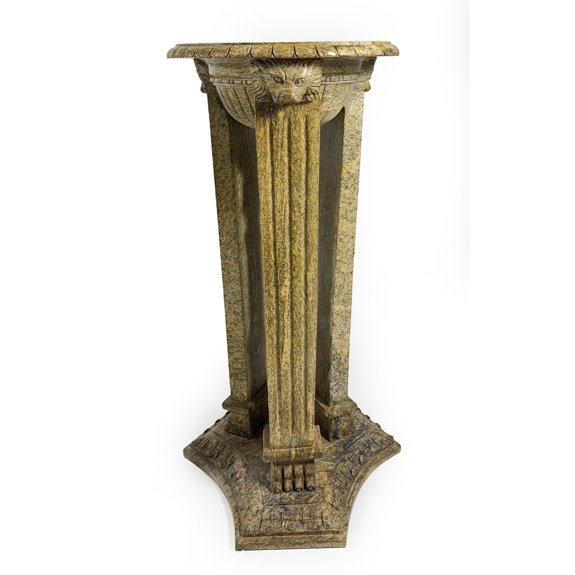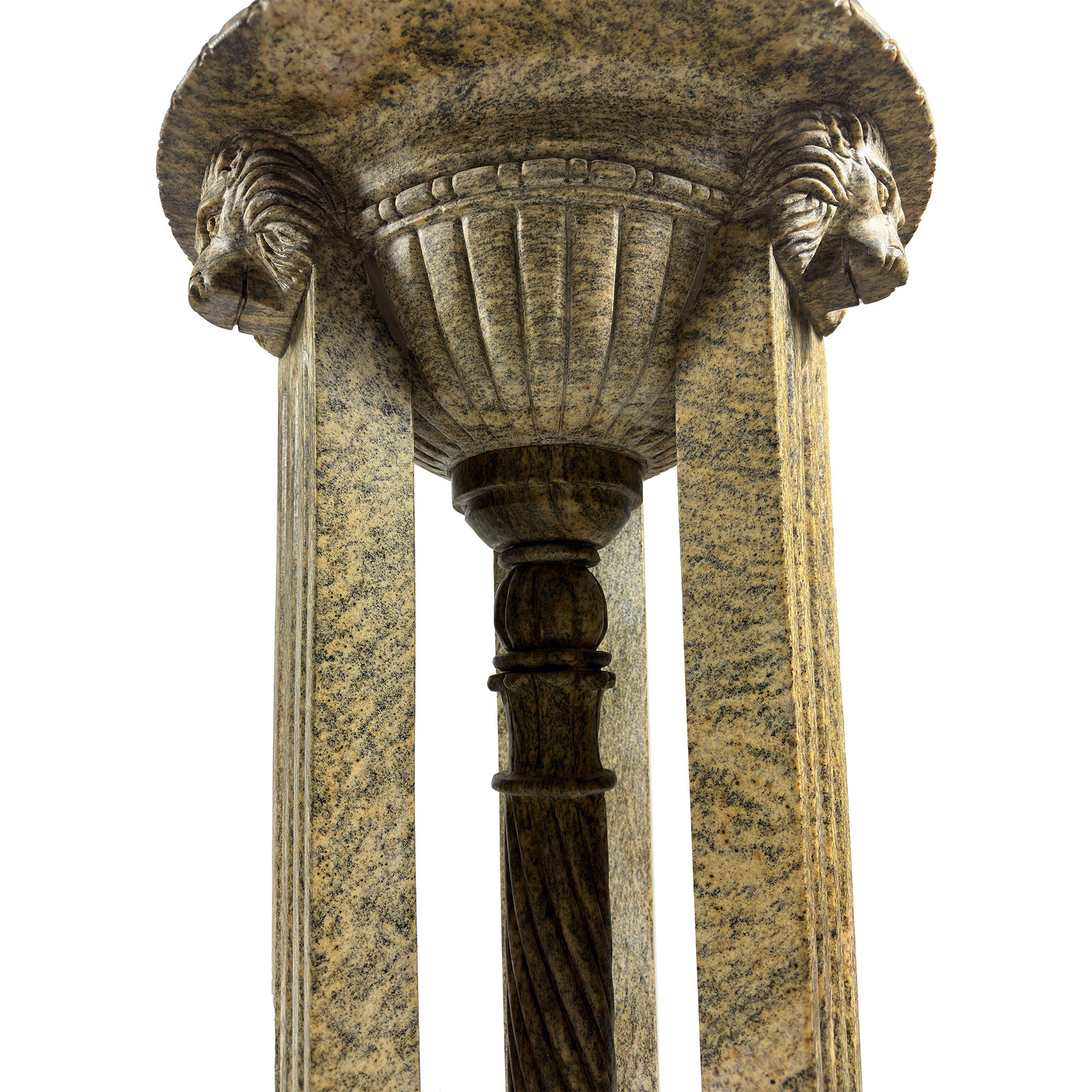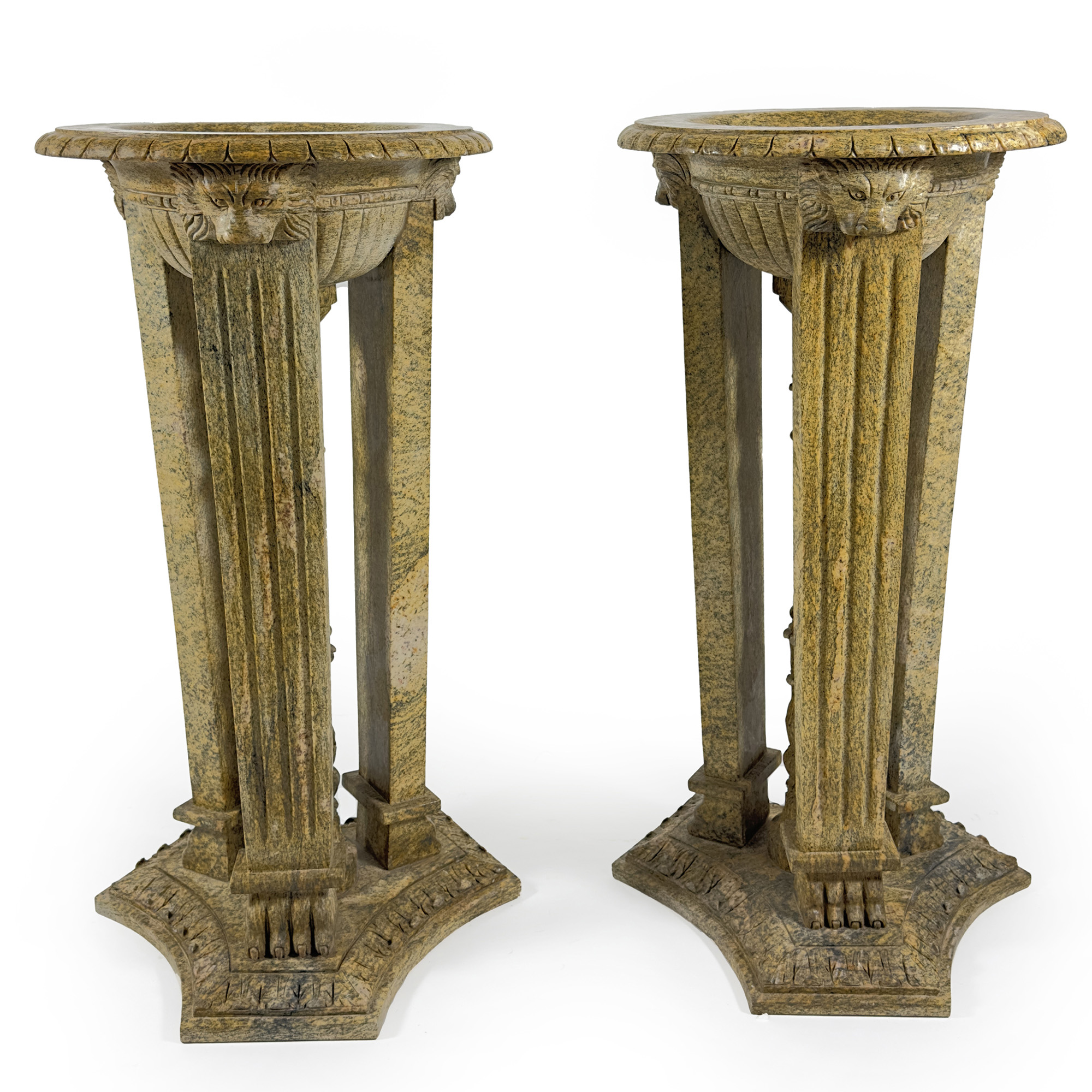 Coppia di tripodi in marmo scolpito, vasca circolare con profilo baccellato sorretta da tre erme leonine su base trilobata, h. cm. 125; d. cm. 64