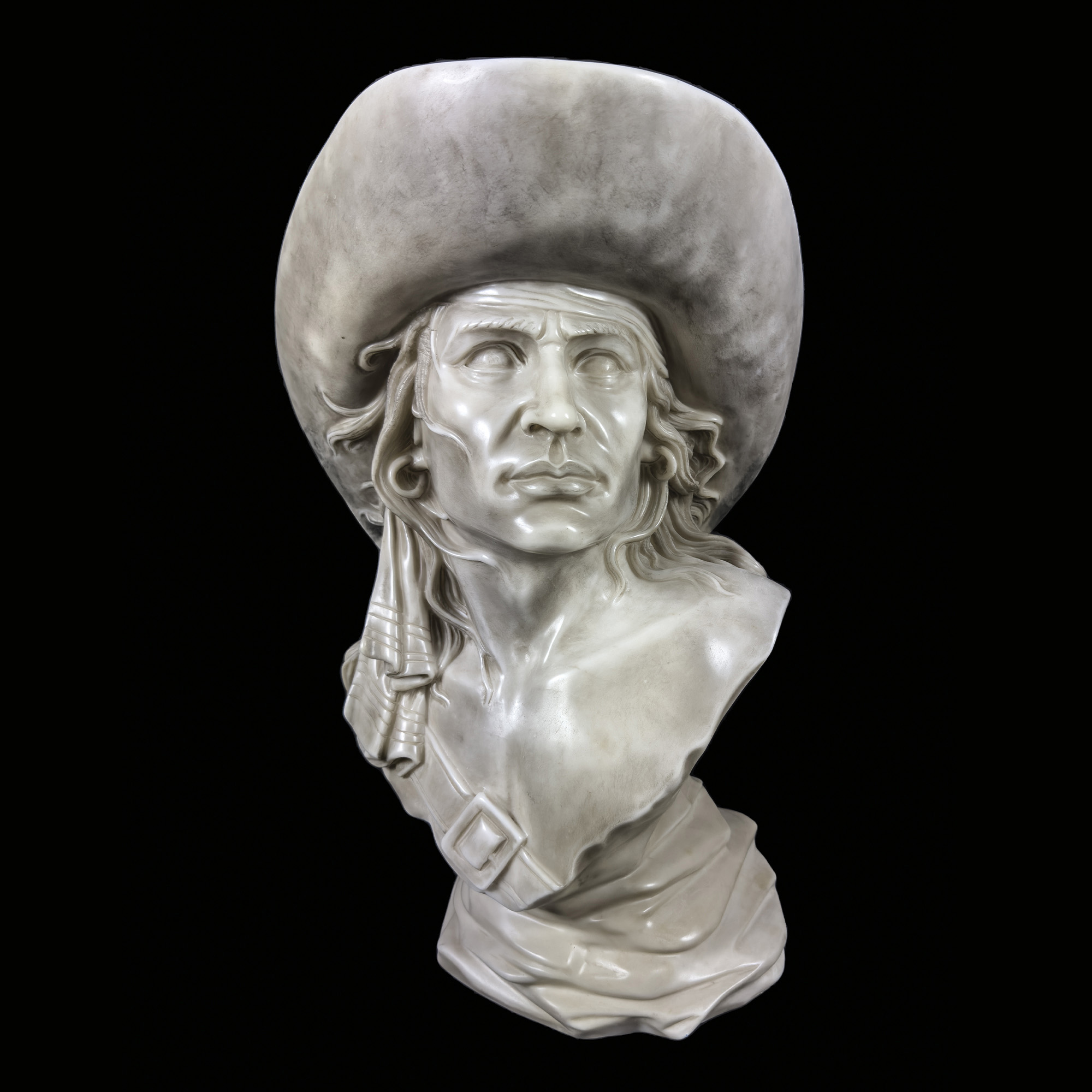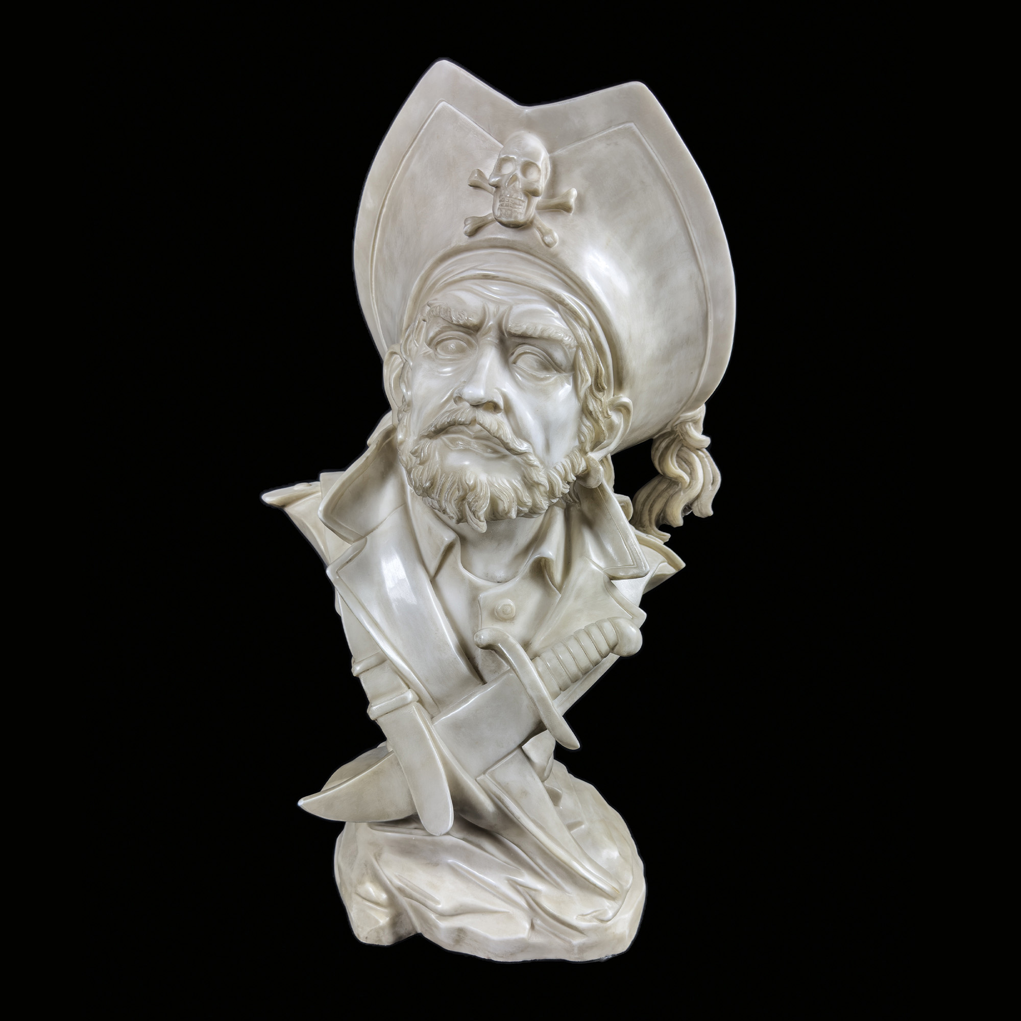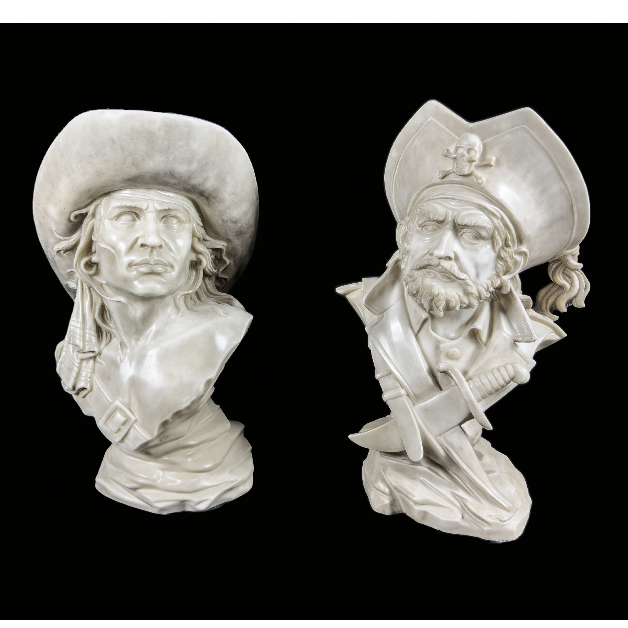 Due busti di pirata in marmo bianco, h. cm. 60 circa