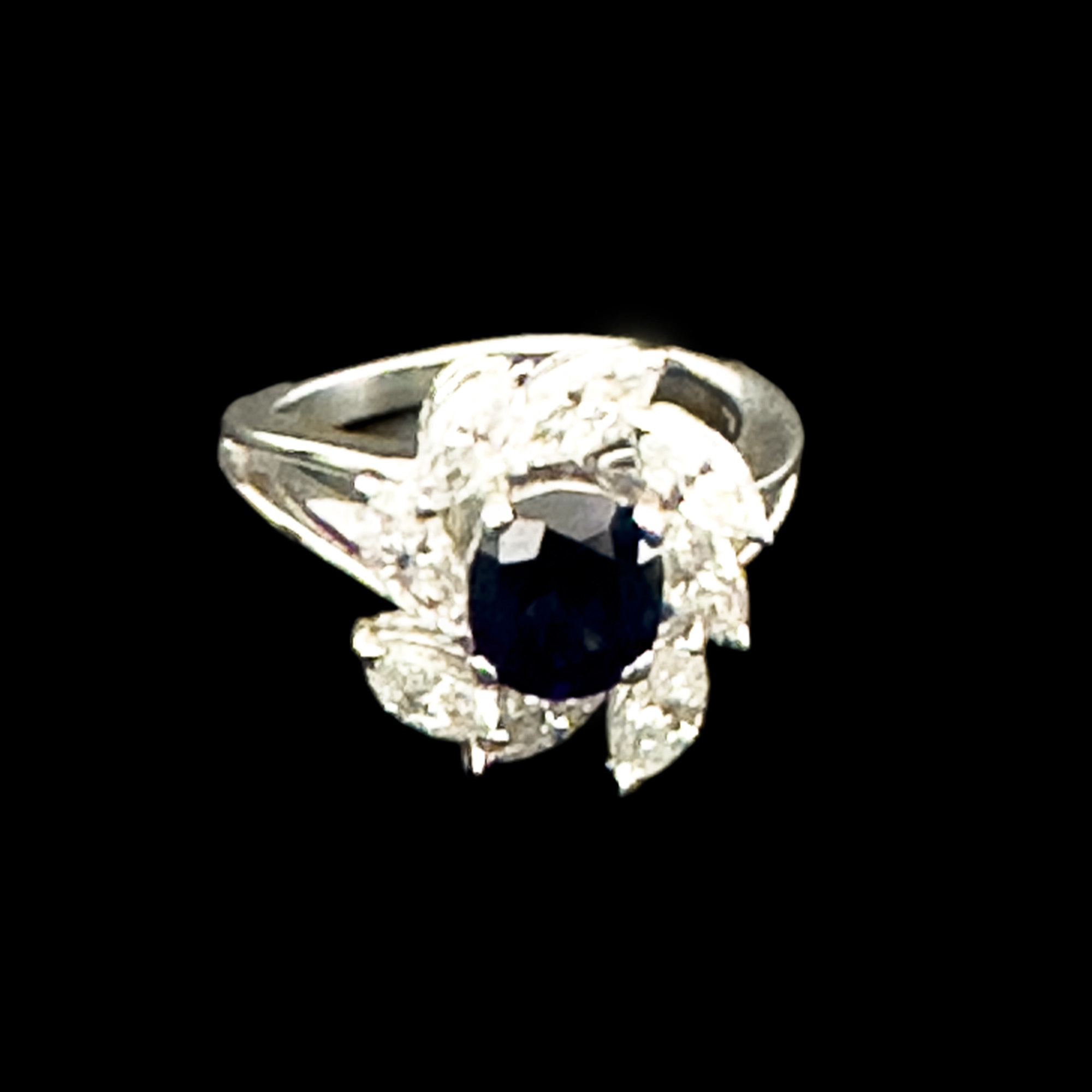 Anello in oro 18kt. con zaffiro Ceylon Royal Blue taglio ovale di ct. 2,10 e diamanti, taglio marquise per ct. 1,80, VVS/F, mis. 12, peso gr. 6,51.