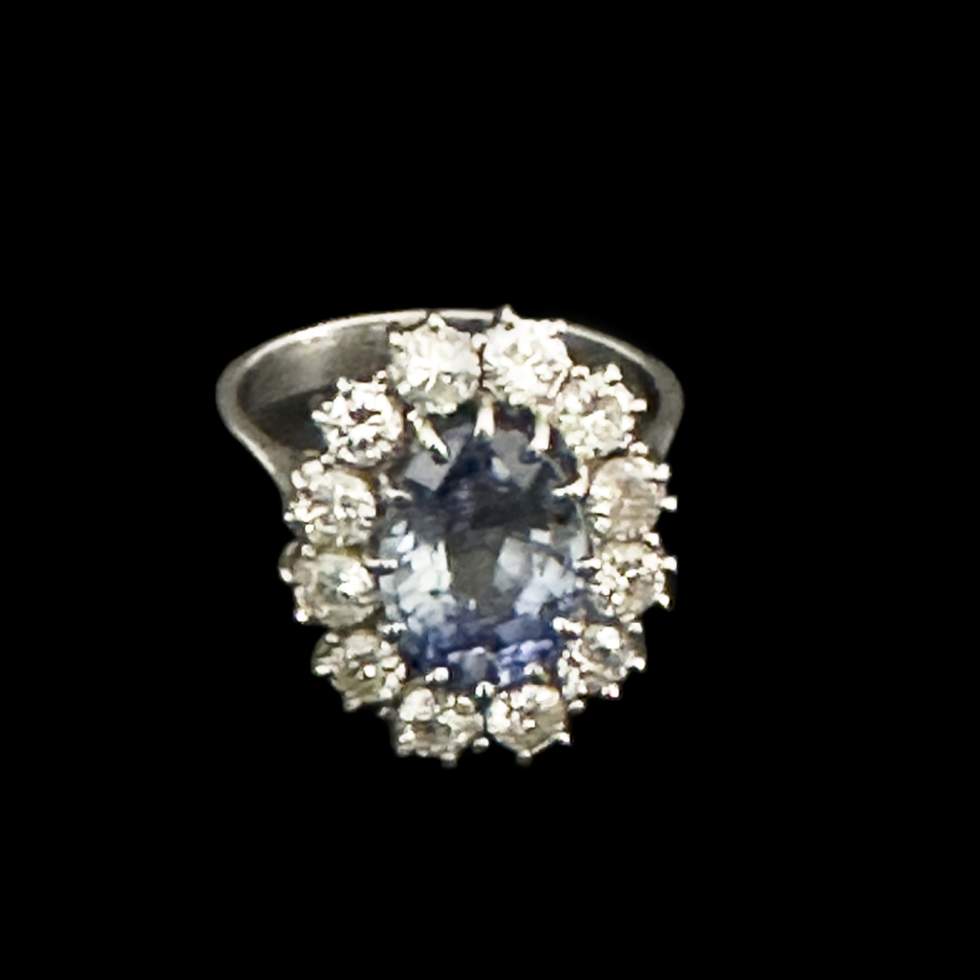 Lotto 385 | Anello margherita in oro 18kt. con zaffiro Ceylon di ct. 3.50 e diamanti,...