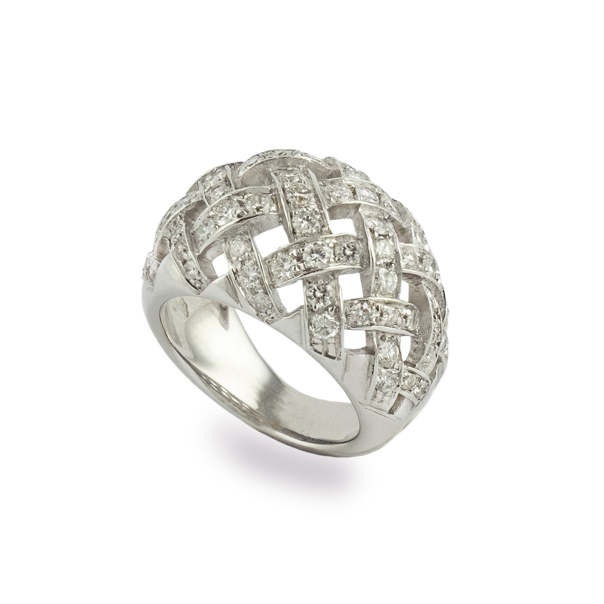 Anello in oro 18kt. a fasce intrecciate con pavé di diamanti taglio brillante, per 2,50 circa, H-I/VS, mis. 14, peso gr. 17