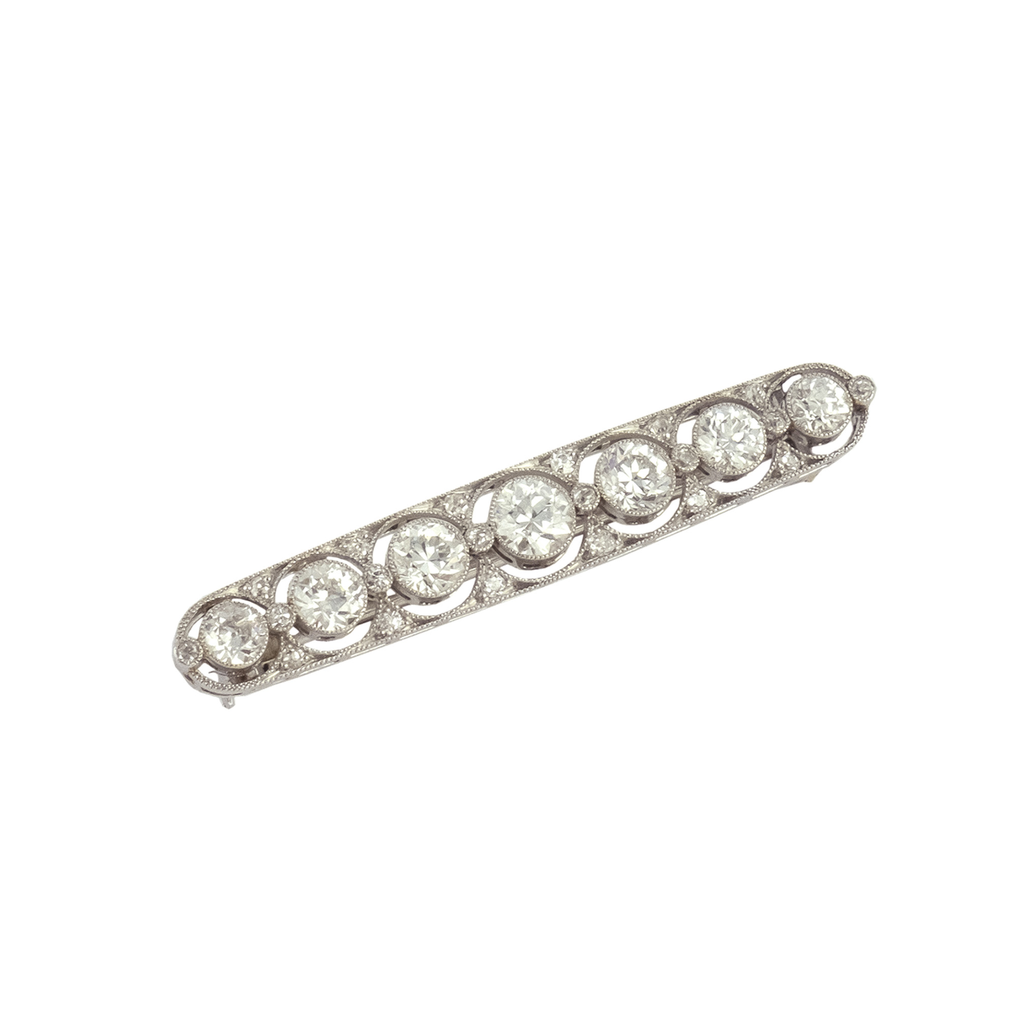 Spilla a barretta in oro bianco 18kt. e platino con 7 brillanti per ct. 3,00, Anni '30/'40, VS/G, l. cm. 5, peso gr. 7,33.
