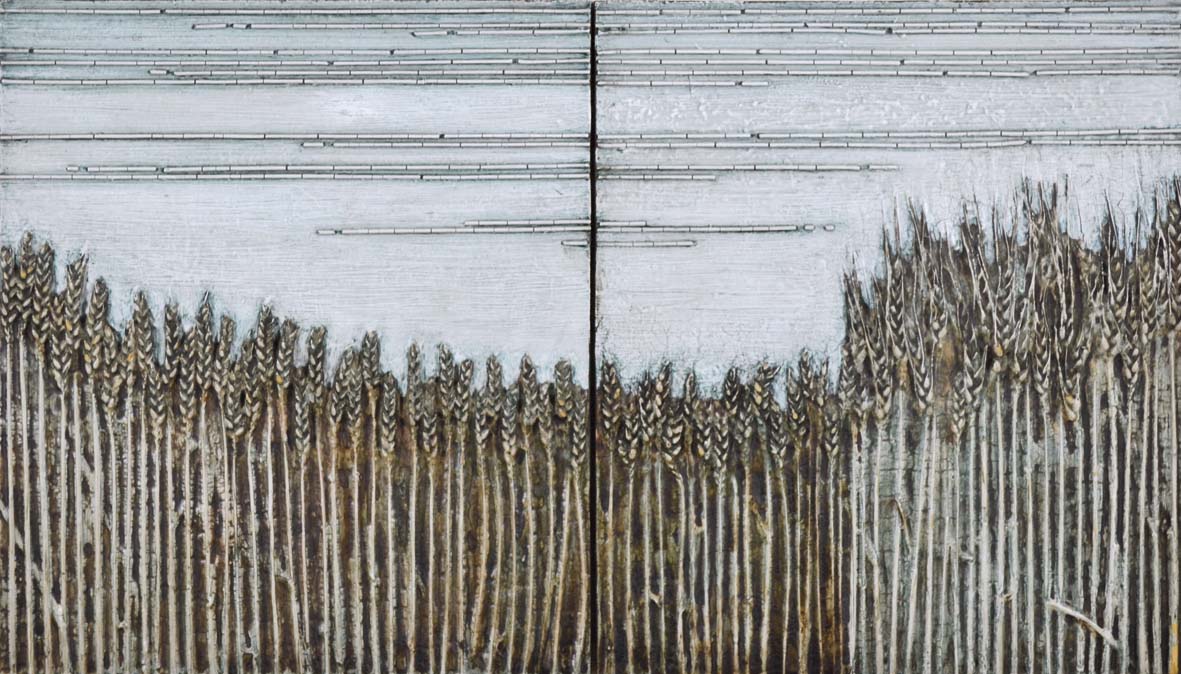 VIVIANI VANNI San Giacomo delle Segnate (MN) 1937-2002 Paesaggio tecnica mista su tavola (dittico) 40x70 Esposizioni: S.I.A.B. Bolzano; Galleria Roggia Grande Trento - etichetta e timbro al retro
