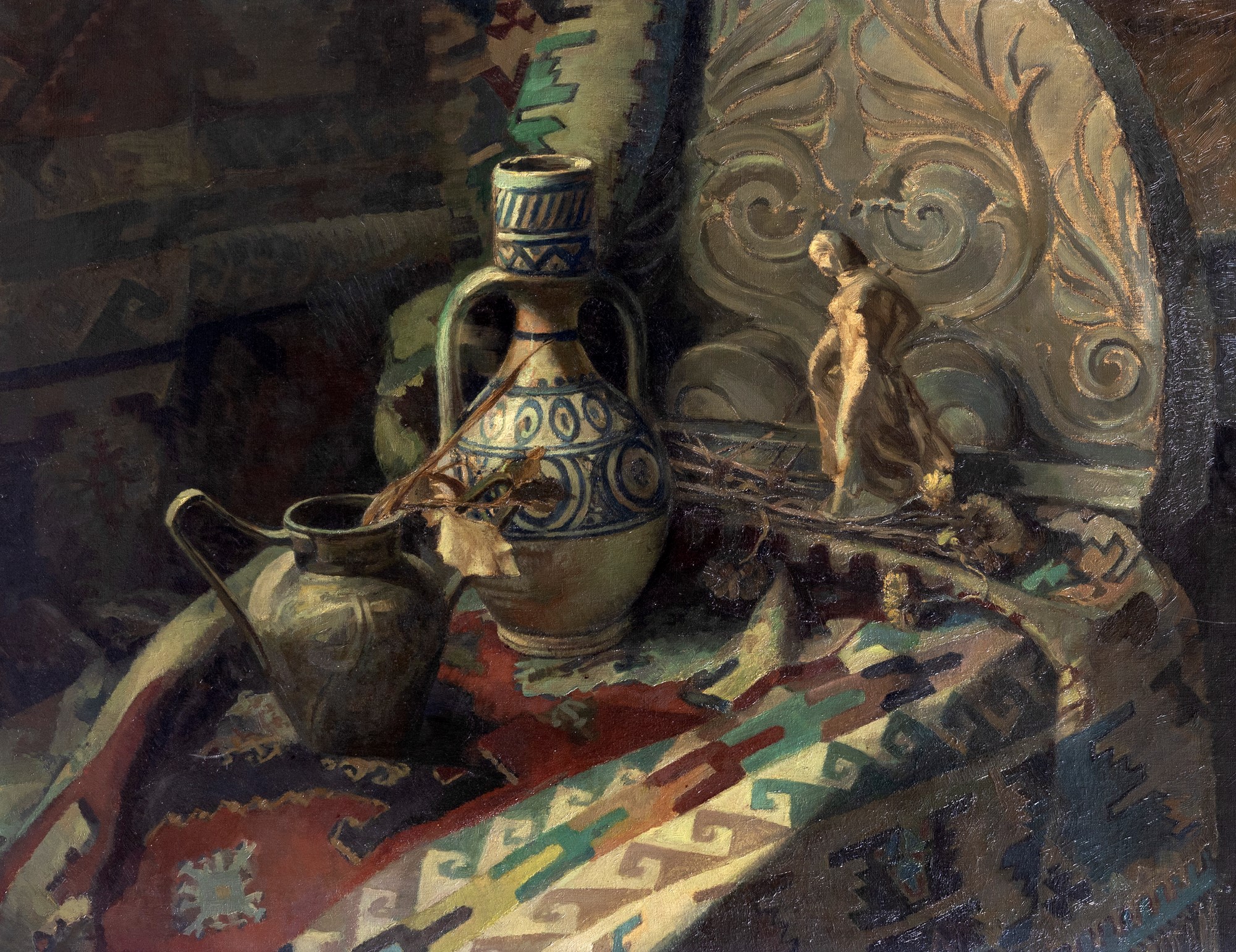 Scuola europea fine XIX - inizi XX secolo - Natura morta con tappeto, vasellame e una scultura